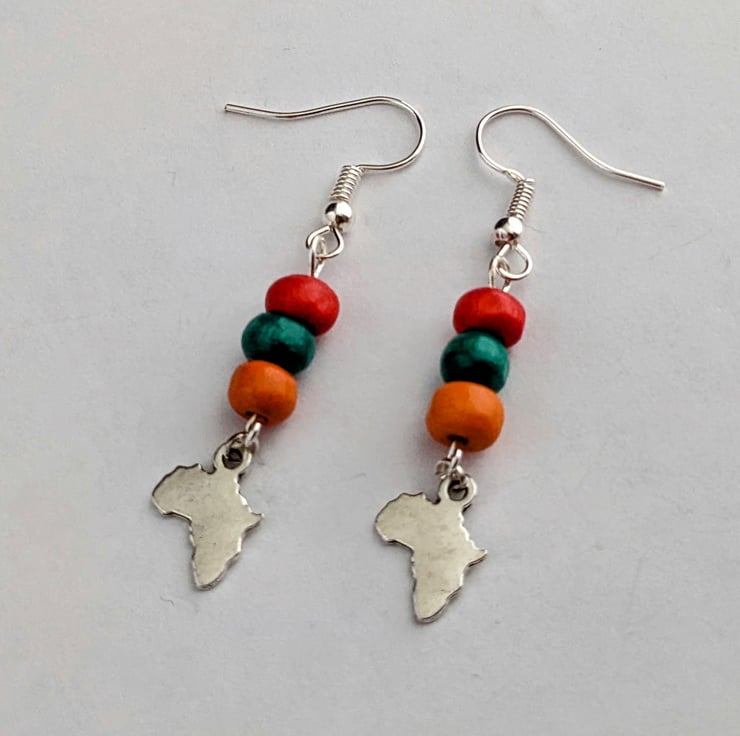 10mm Tibetan silver Africa map charm and 6mm wooden beads (red, green, orange) on hypo allergenic silver plated hooks. Length 30mm excluding hooks. In an organza gift bag.