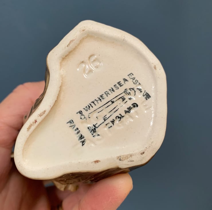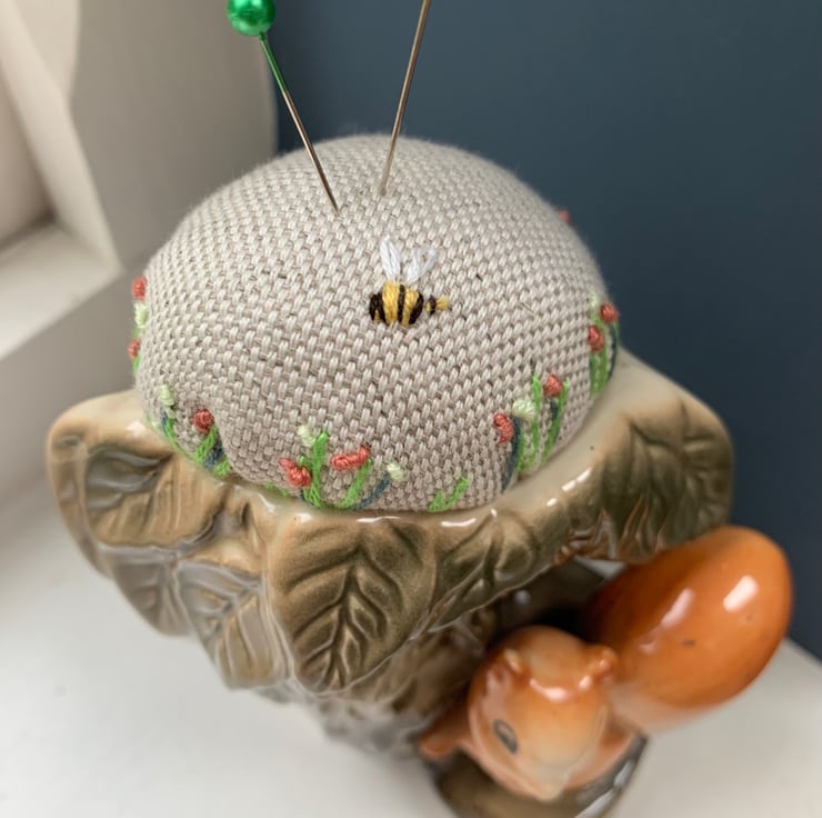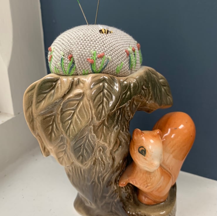 Pretty embroidered pincushion in a vintage squirrel vase. The linen cushion has been embroidered with tiny flowers and a bee.