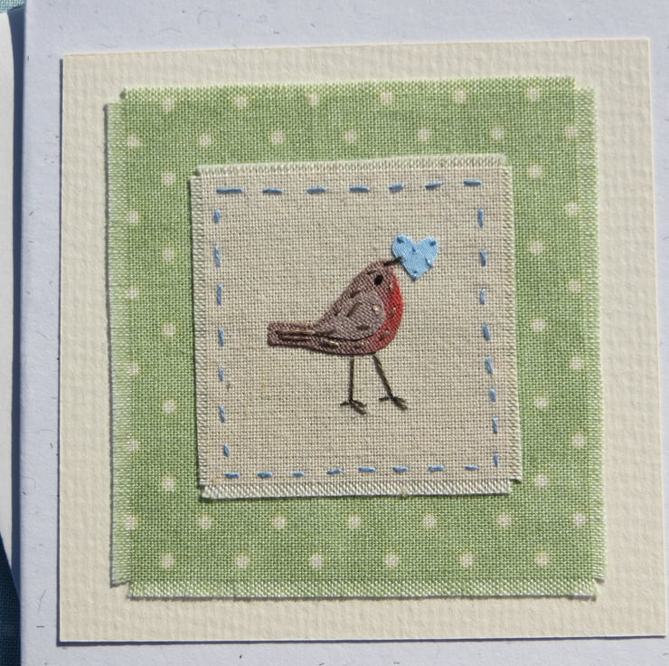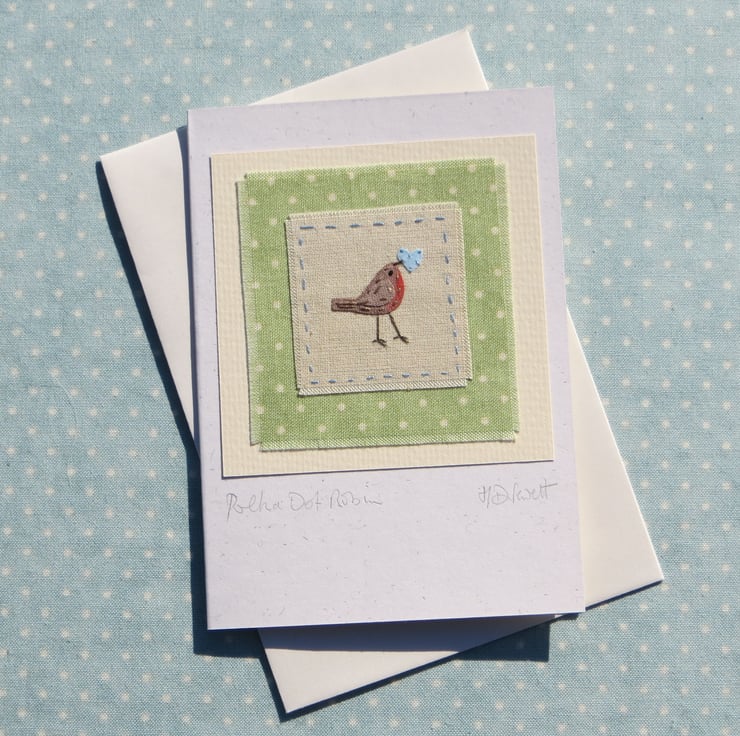This is a small handmade greeting card featuring a miniature hand-stitched applique made using recycled hand-dyed cotton with intricate embroidered details, mounted on to a cheerful piece of polka dot fabric. It is entitled 'Polka Dot Robin' and would be perfect for Christmas, or any winter celebration, definitely a card to keep!