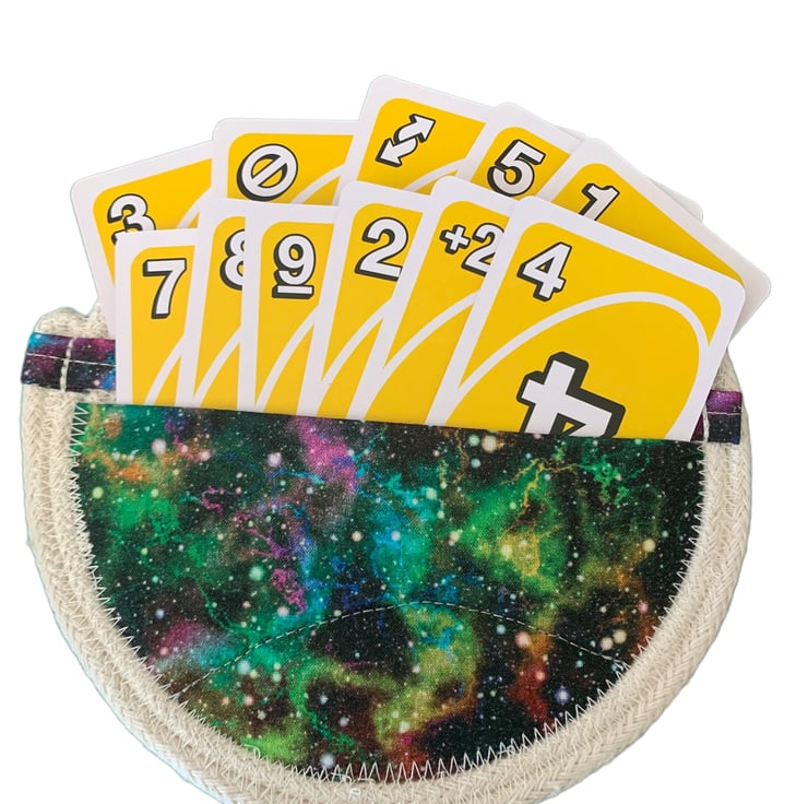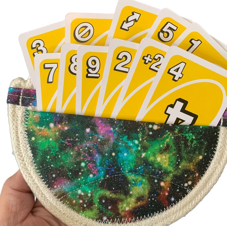 A card holder for up to 15 playing cards, ideal for Bridge, Canasta or UNO. Approximately 6 1/2” (16cms) and 100% cotton.