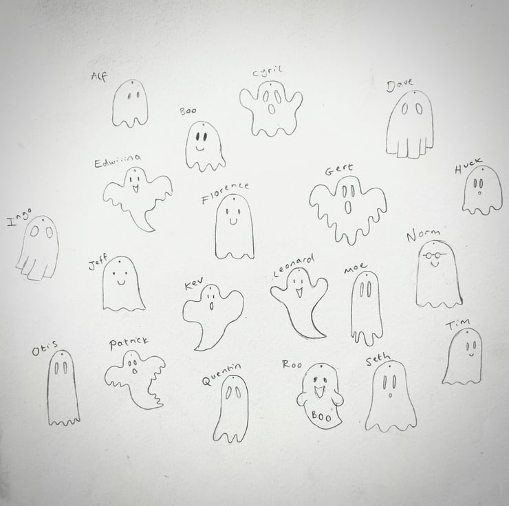 The three ghosts in the first picture are: Boo, Florence and Jeff. The one on the photo with a dark blue background is Ingo.
