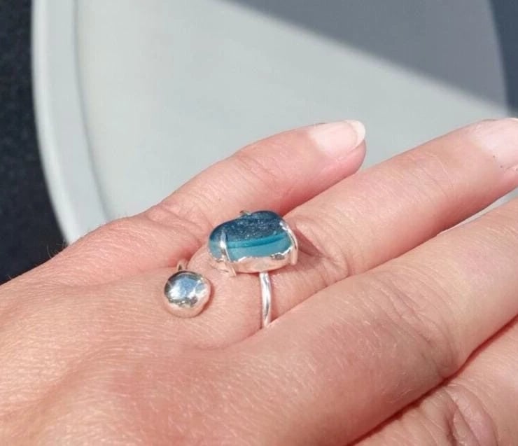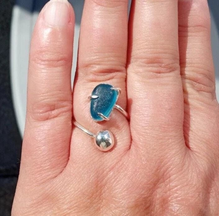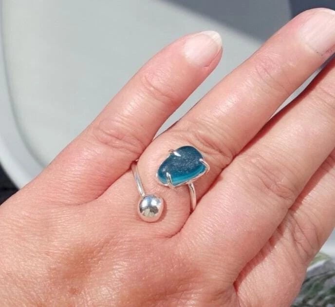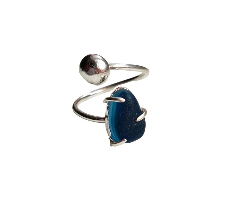 Recycled Sterling Silver handmade ring with deep ocean blue multi seaglass setting from Seaham