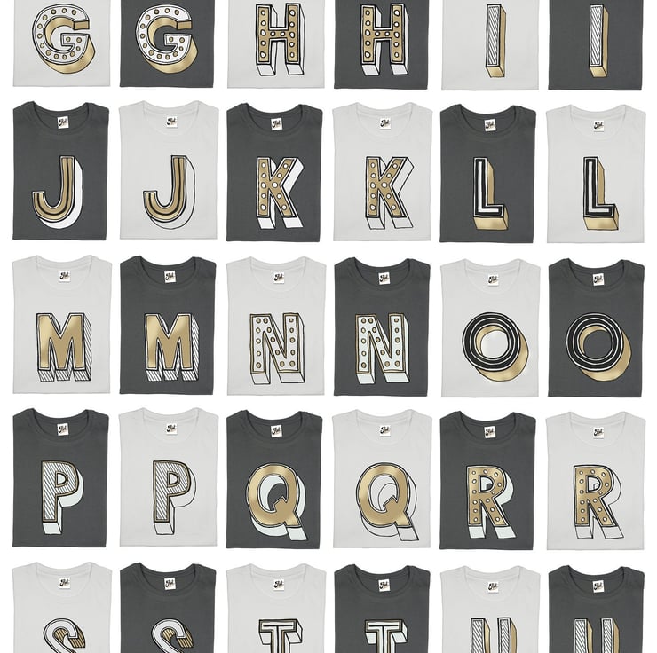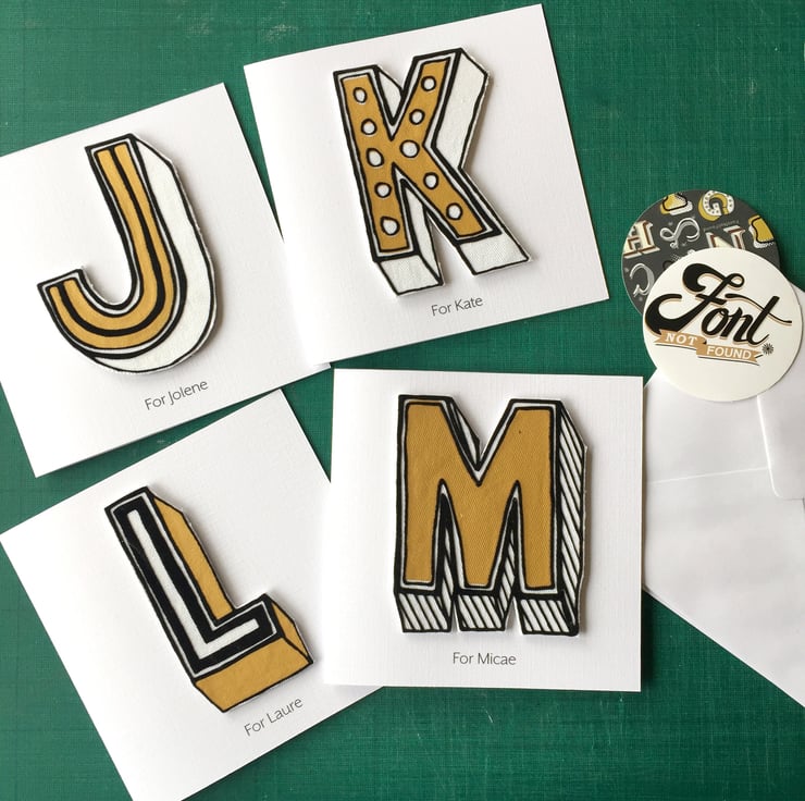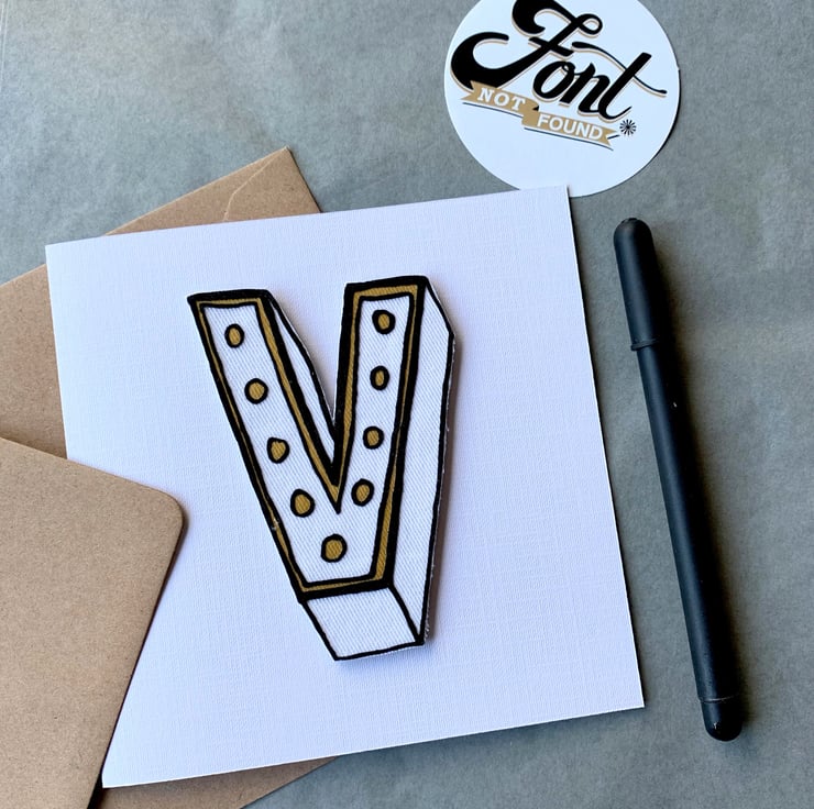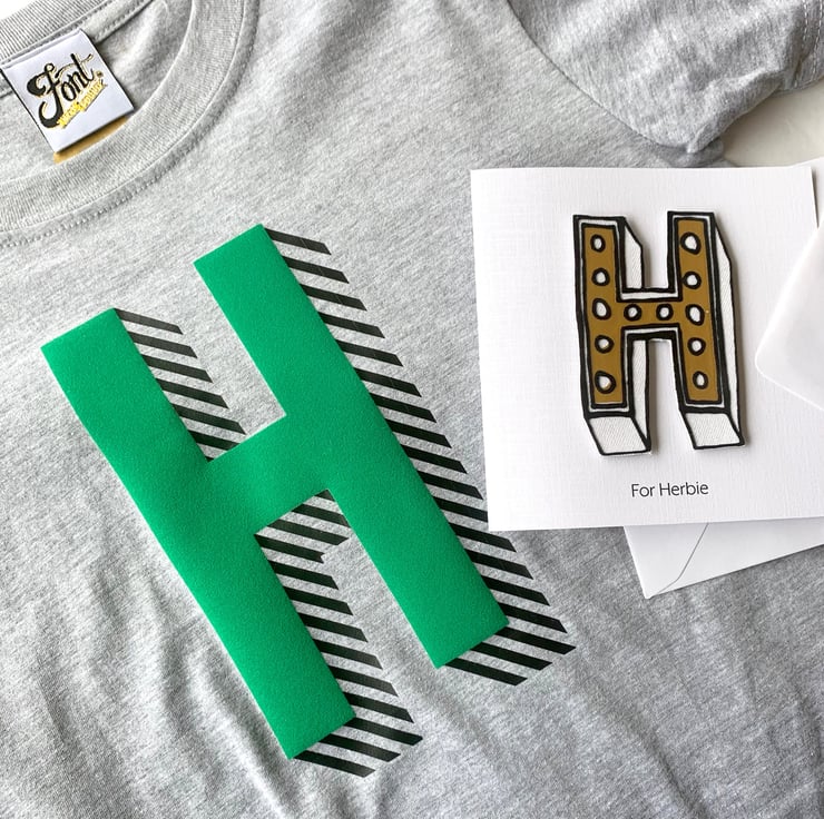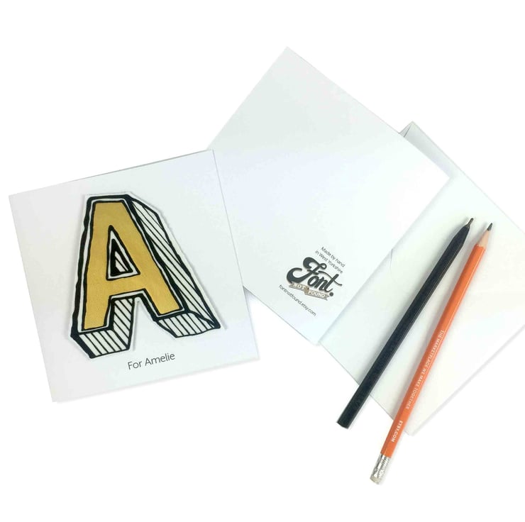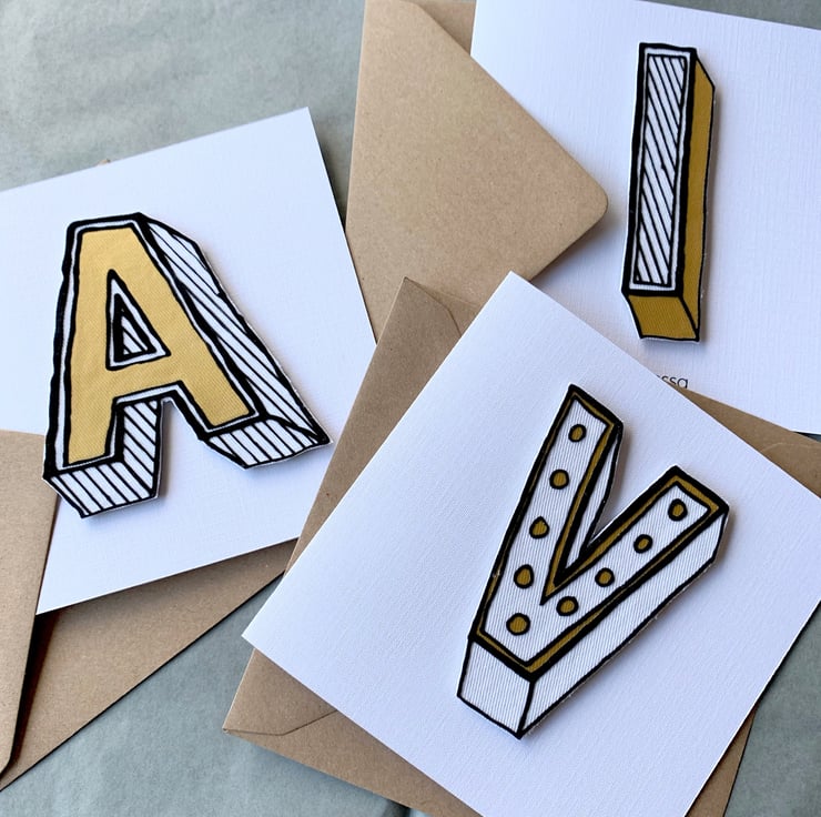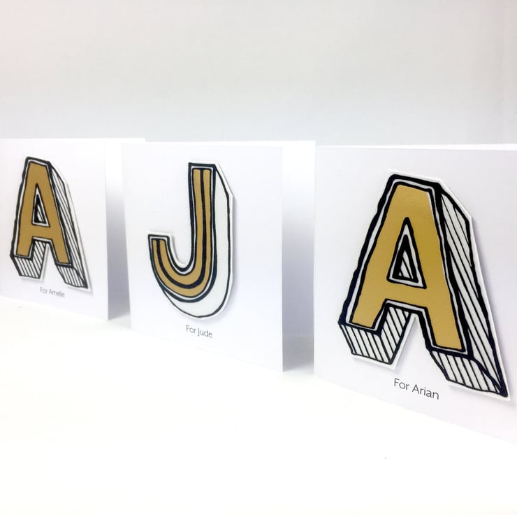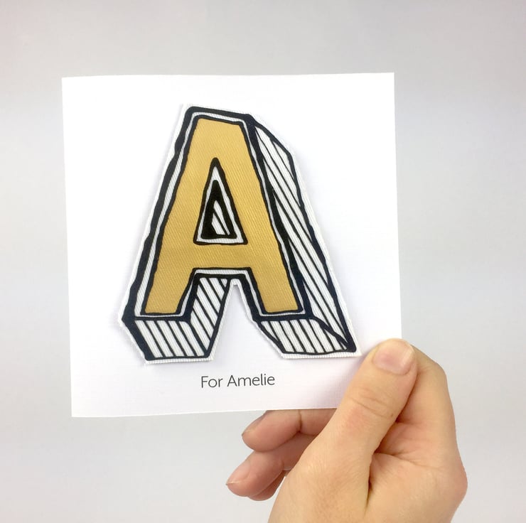 It features our own 'Juniper Red' typeface designed by us- a quirky alphabet (and numbers available), which are a mish-mash of styles. Take a look at the last image to see how your chosen letter will look. Your large letter will be made up of layers of black flock and gold on top of cotton twill fabric, raised up above the quality 280 gsm card.