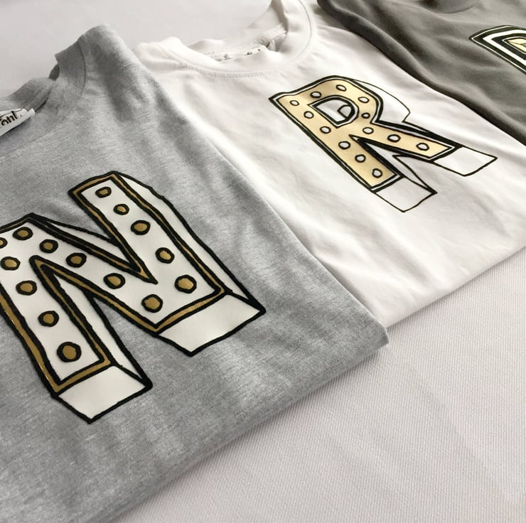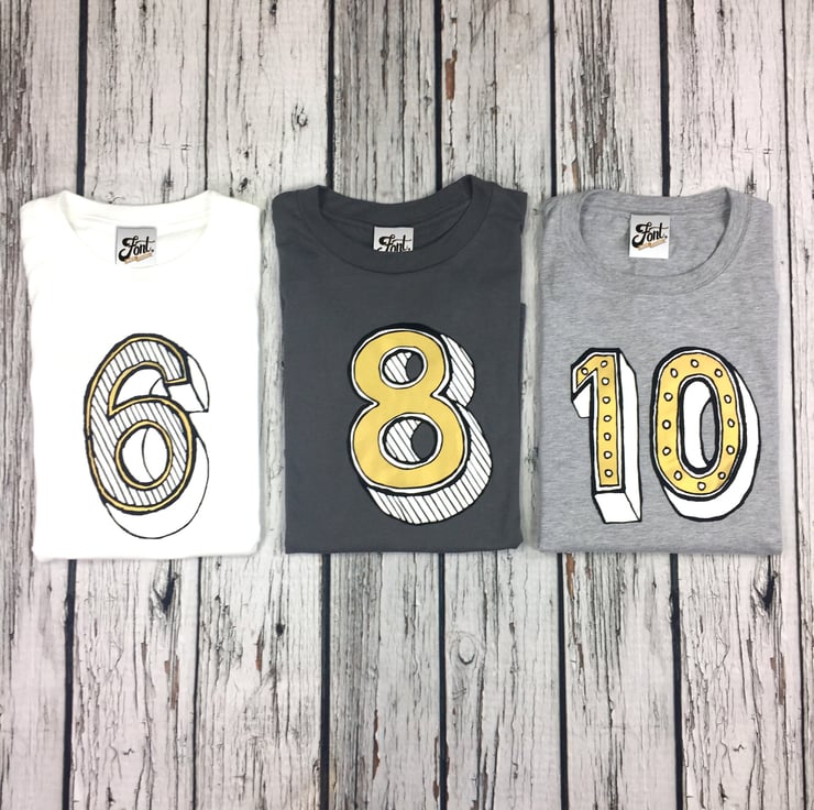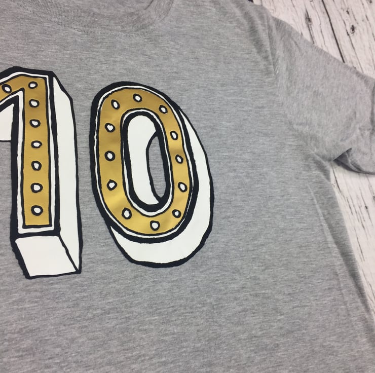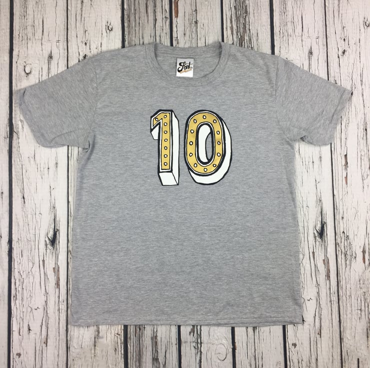 Our terrific ten can be purchased on any of our kid sized Shirts (or pretty much any of our products if you so desire). This tremendous ten T-shirt can come in white, heather (light) grey or (mid) grey cotton and features our own 'Juniper Red' font which is a mixture of white, shiny gold, and black flock lines.