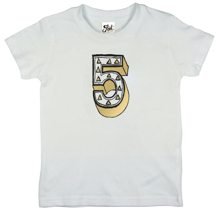 Font Not Found's fancy number 5 t-shirt can be ordered in any of our kids sizes. This Fab T-Shirt can come in white, heather (pale) grey or (mid) grey and features our own 'Juniper Red' font which is a mixture of white, shiny gold, and black flock lines. We also do other numbers and the full alphabet in our other listings...