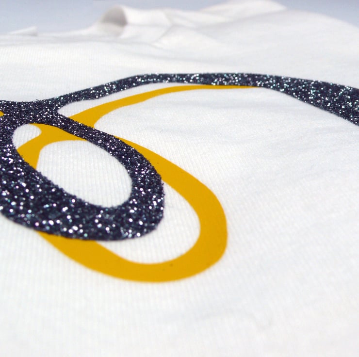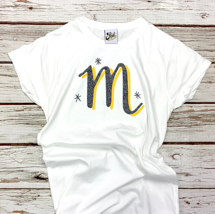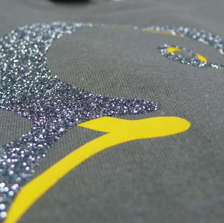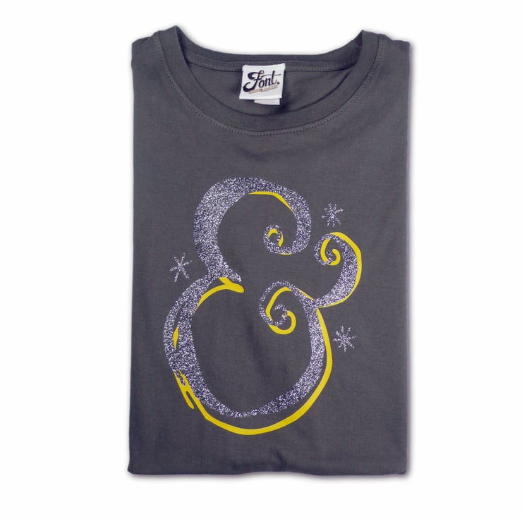This glittery ampersand is from our 4th font 'The Monroe' designed by us. It's made up of shiny grey glitter with a yellow shadow you can wear it on a grey or white cotton T-Shirt. Glitter! yes! (Don't worry it washes well at 40 degrees and you can iron on reverse).