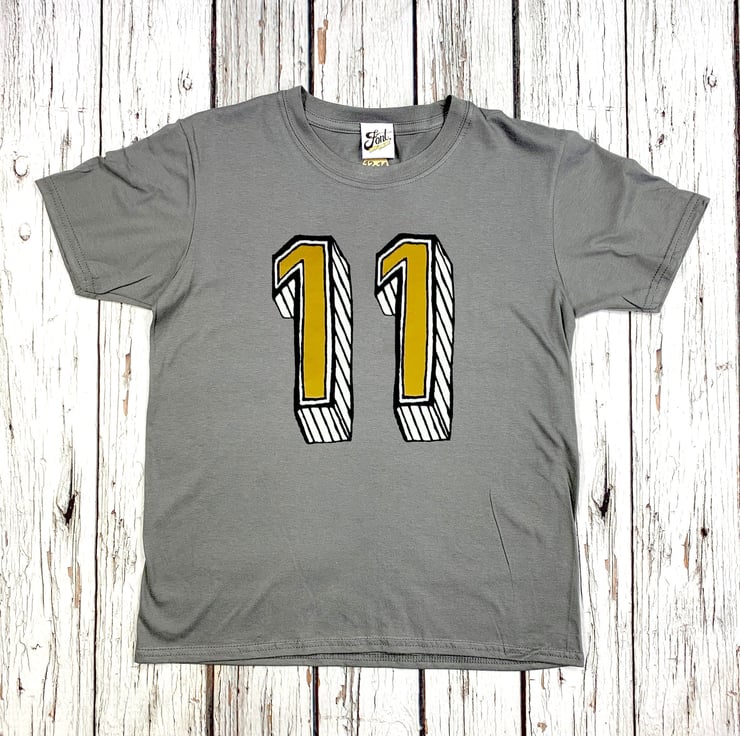 These numbers are originally hand-drawn by ourselves, so they are exclusive to us. They are a quirky bunch and perfect for buying each year as the numbers vary slightly. The shirt can come in white, heather (light) grey or (mid) grey cotton and the number is a mixture of white, shiny gold, and black flock lines.