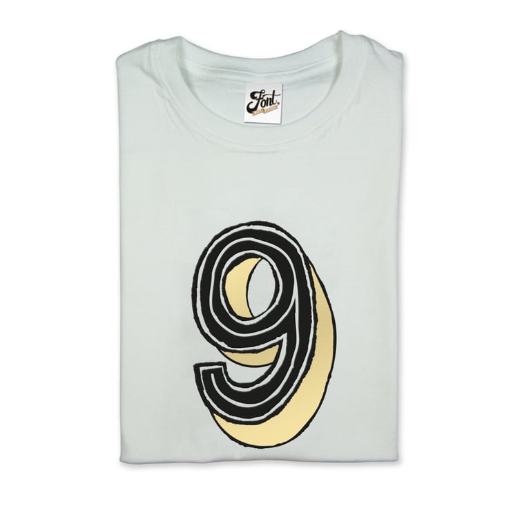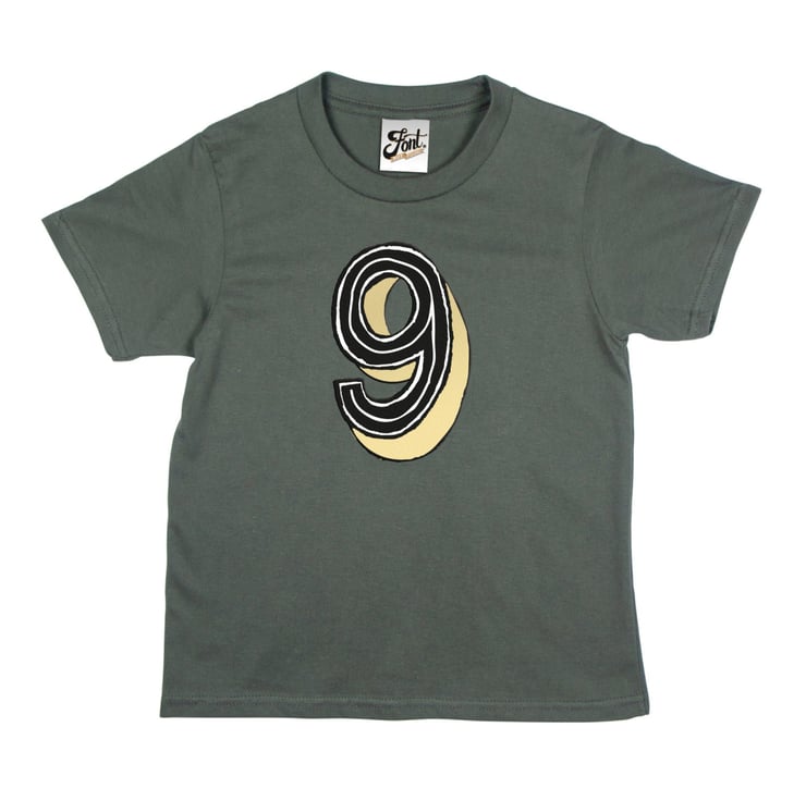 Our naughty nine can be purchased on any of our children's sized T-Shirts (or any of our products if you so desire). This notoriously, noble, nine shirt can come in white, heather (light) grey or (mid) grey and features our own 'Juniper Red' font which is a mixture of white, shiny gold, and black flock lines.