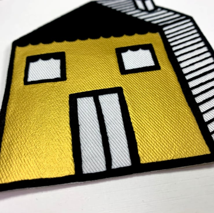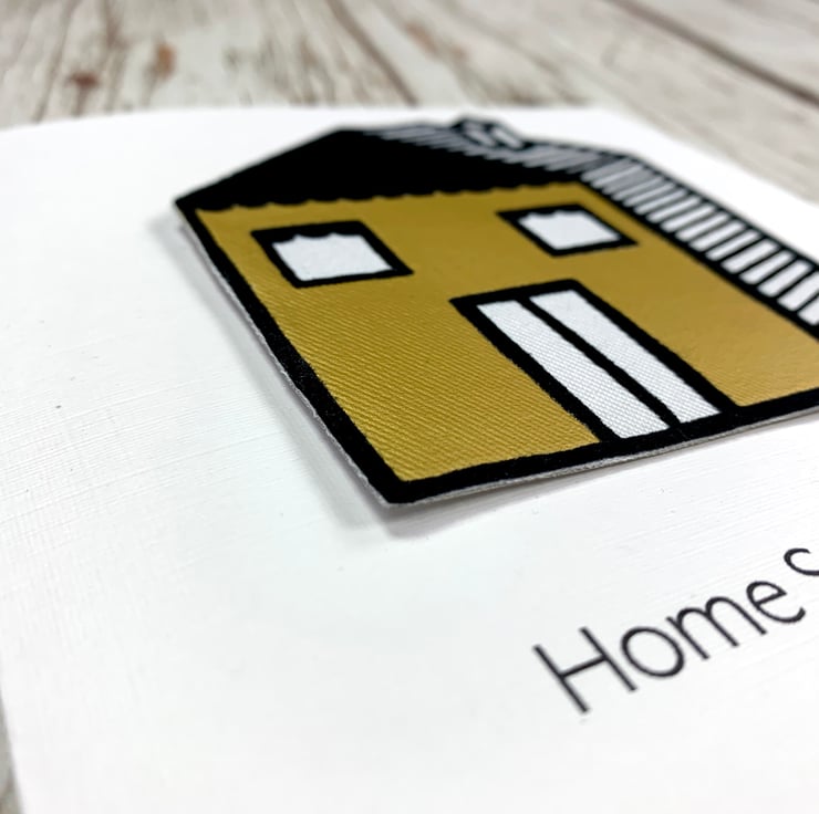 Here's our glorious 'New Home' greetings card, it's made up of layers of black flock and gold on top of cotton twill fabric, raised up above the quality 280 gsm white card.