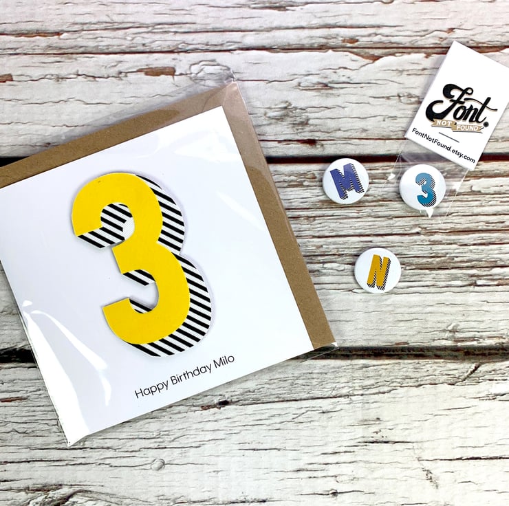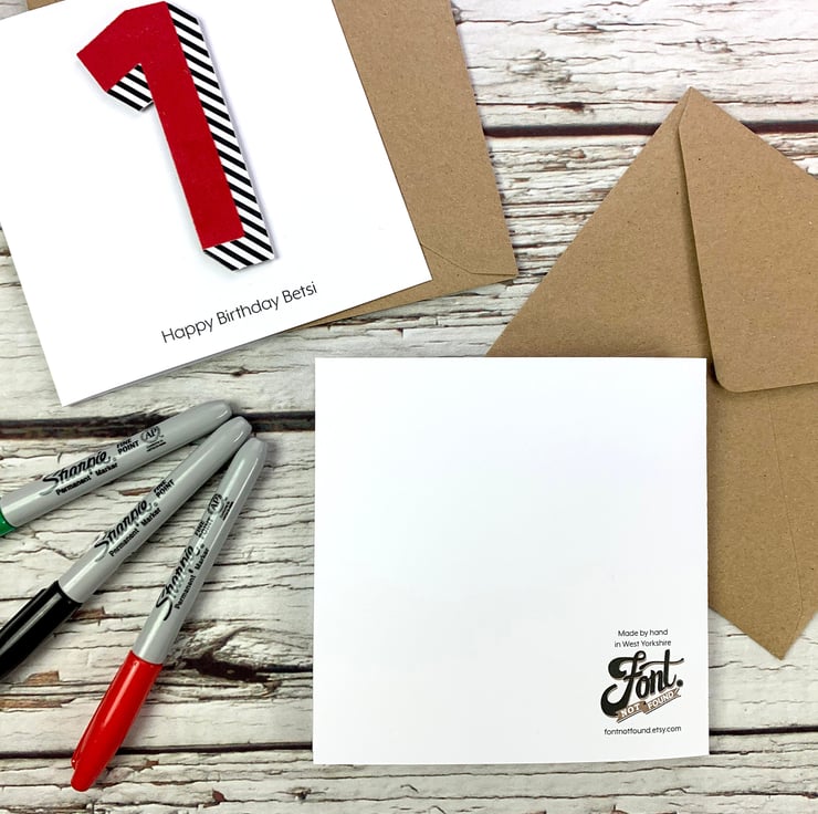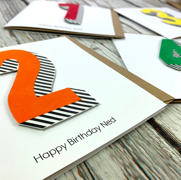 These are our cards that feature our own 'Bradford Buzz' typeface designed by us- a bright and bold set of numbers and letters. Your number will be made up of layers of colourful flock and black stripes on top of cotton twill fabric raised up above the quality 280 gsm white card.