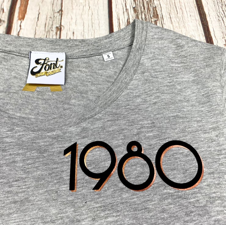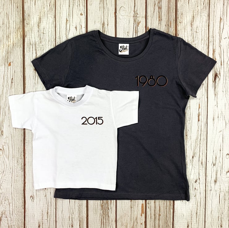 This is our Branson typeface designed by us in March 2020. It's a beautifully elegant collection of numbers and letters, of two layers: a black flocked top layer sat on a shiny copper shadow layer. This listing is for you to pick a year, which will sit on the left breast area. We also have men's unisex, and kids T-shirts for you to get family matching ones.