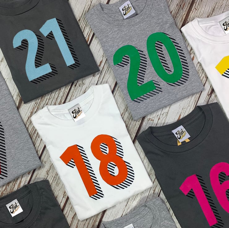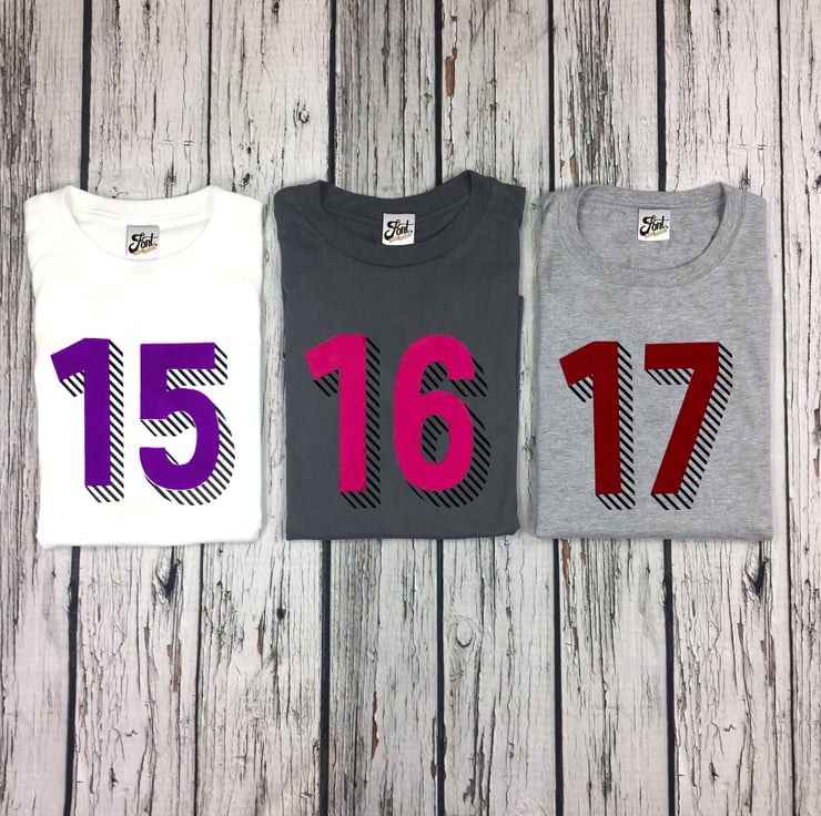 Big Birthday T-Shirt, 15, 16, 17, 18, 19, 20 and 21 year old Malefemale Number.