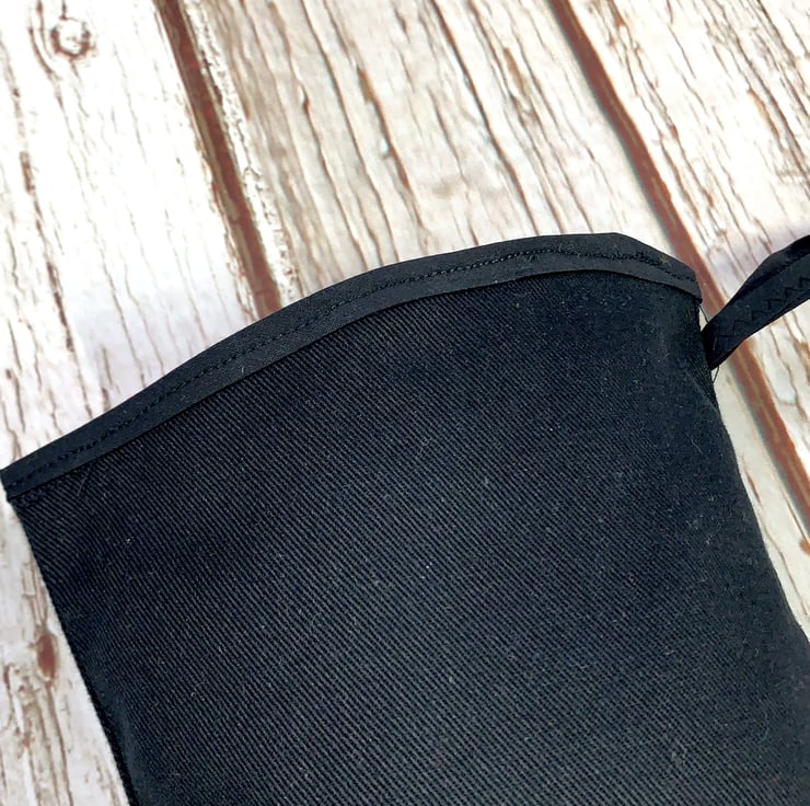 The stocking is made using a sturdy black cotton twill with black bias across the top and is available in two sizes, regular and large. This listing is for the LARGE size.