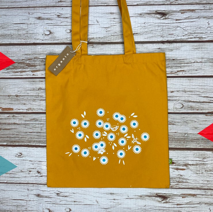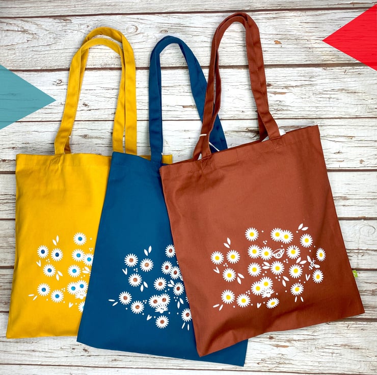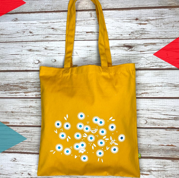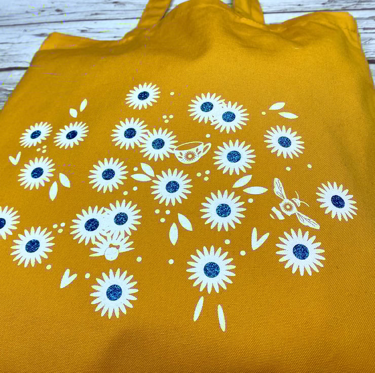 This gorgeous bag features my daisy picnic print, printed by myself in my Yorkshire home studio; there will be a few imperfections, because that's how I print! The floral centres are little circles of blue glitter.