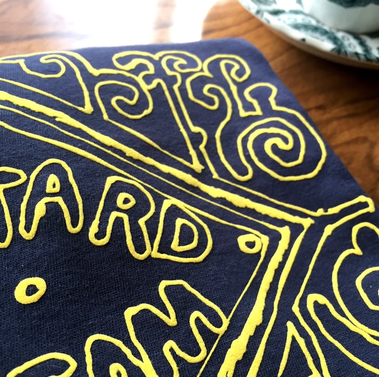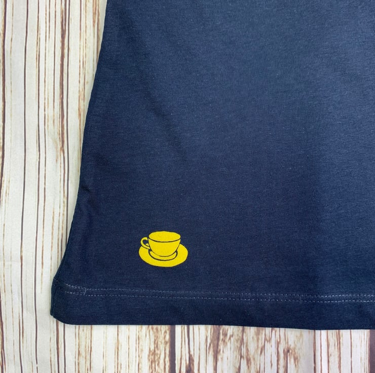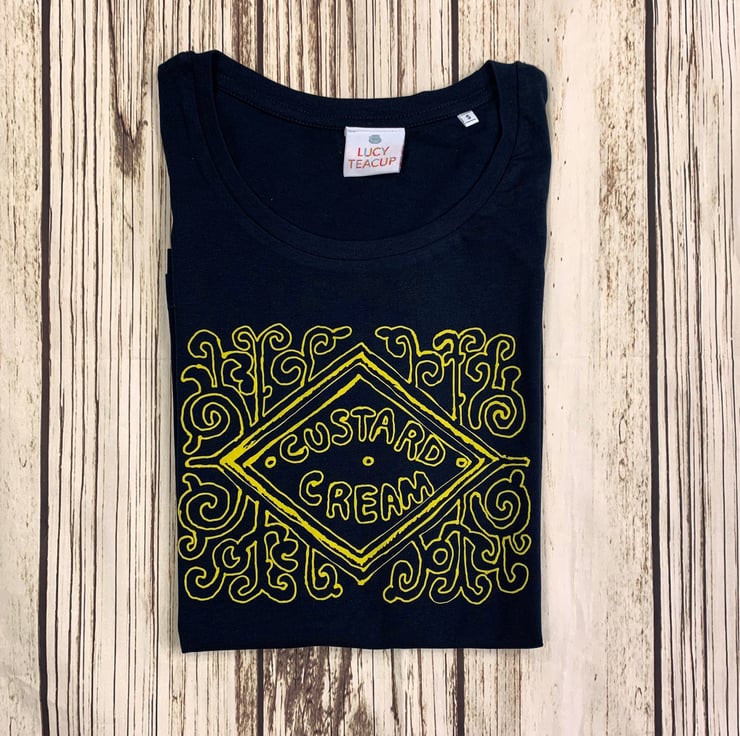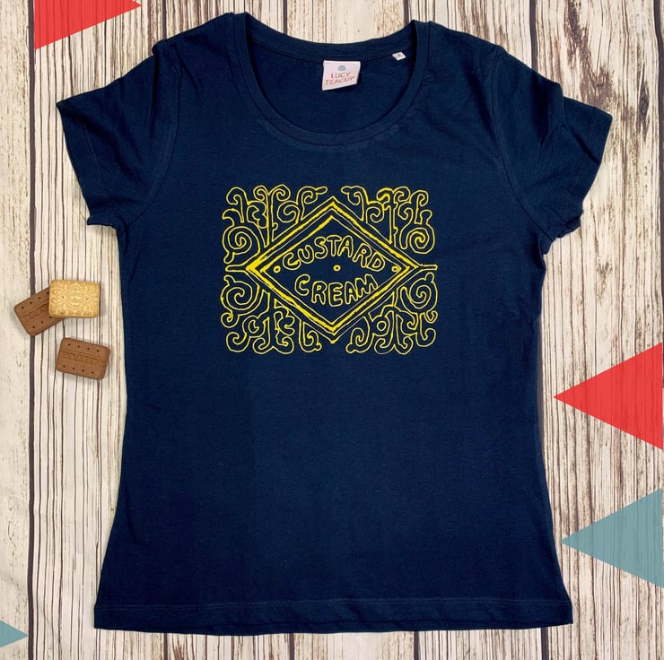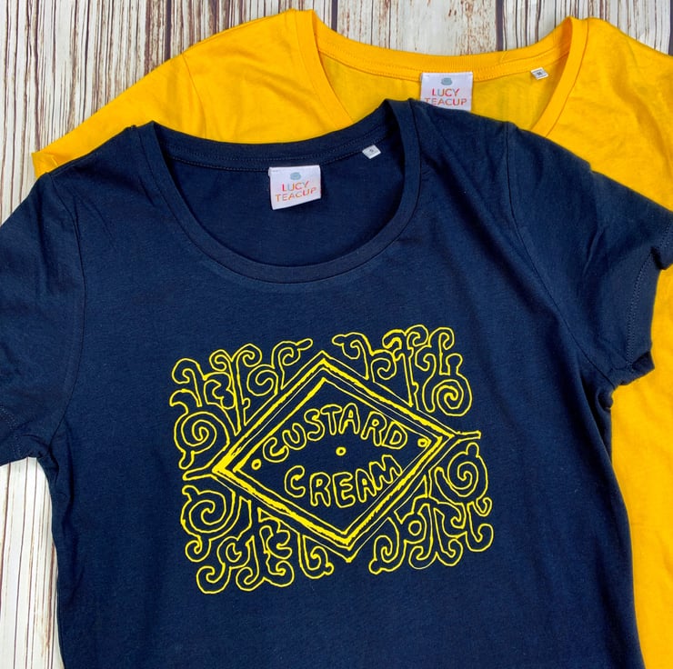 The design is from my own custard cream drawing transferred onto a Navy Blue top in glorious yellow flock-It's nice and soft, lovely to stroke. The custard cream is my favourite biscuit of all time and a British favourite too. I guess as you've searched for 'custard cream t-shirt' on it's one of your fav's too!