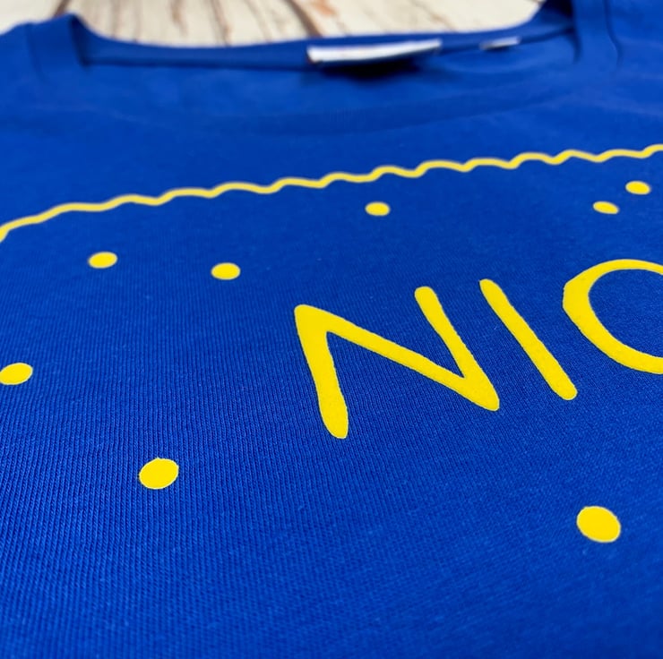 The design is from my own Nice biscuit drawing transferred onto a lovely bright Royal Blue top in glorious yellow flock-It's nice and soft. This shirt is perfect for people who are nice or who want to pretend they are nice.