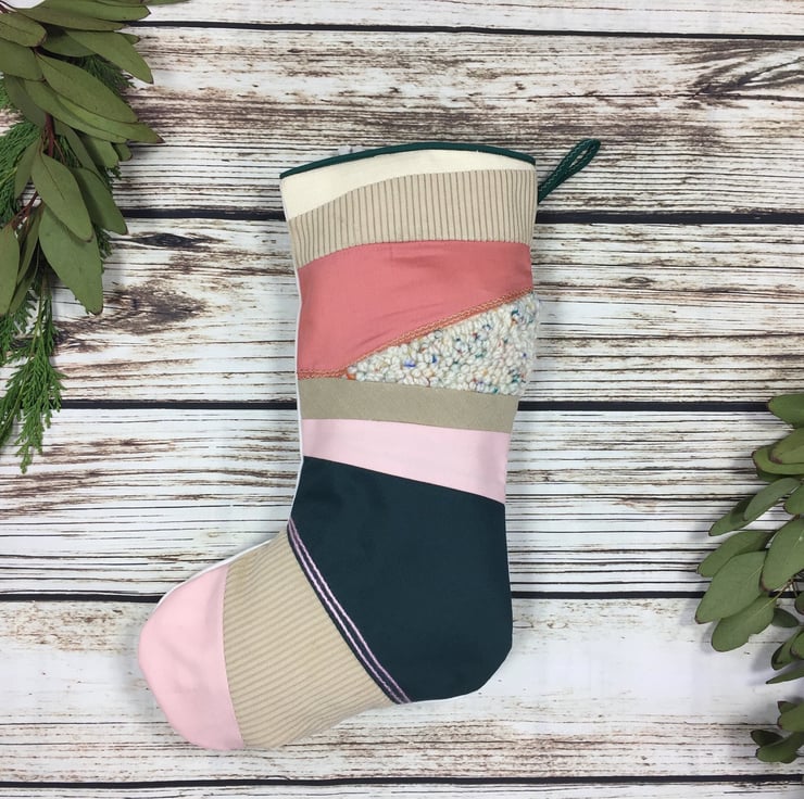 Handmade Christmas Stocking- patchwork punch hook! Cream, green and pink colour