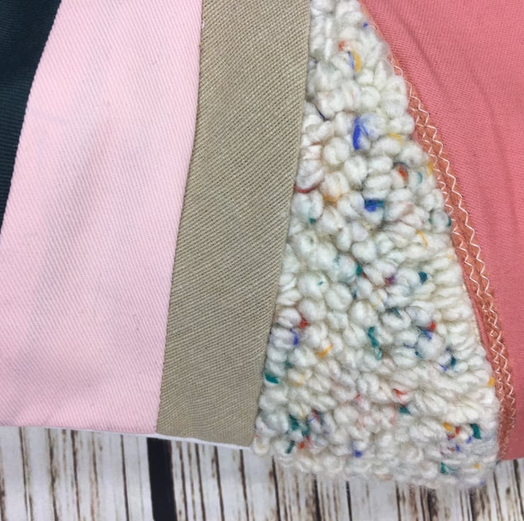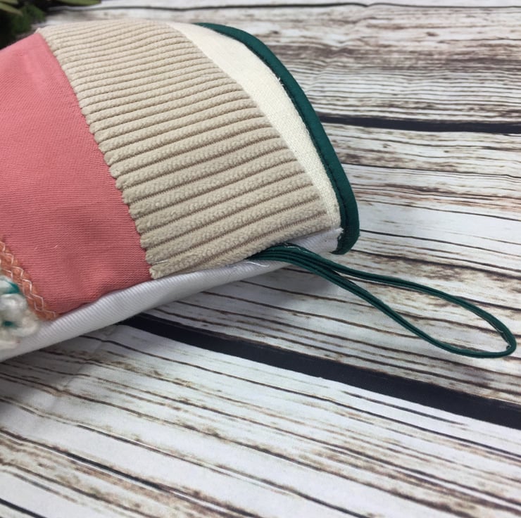 This stocking is made up of different sections of fabrics and textures. One of the sections is punch hooked with a chunky cream mix wool to give a lovely soft textured area other sections are built up with more fabric or pops of wool. I've used corduroy and cottons and the hook is in a green coordinating cotton. It's backed with a sturdy white twill too.
