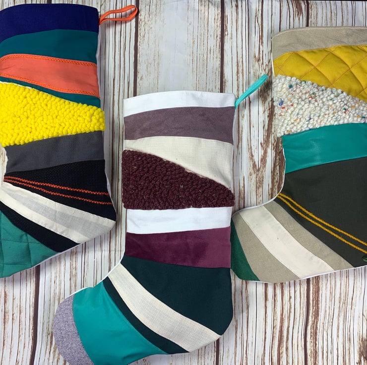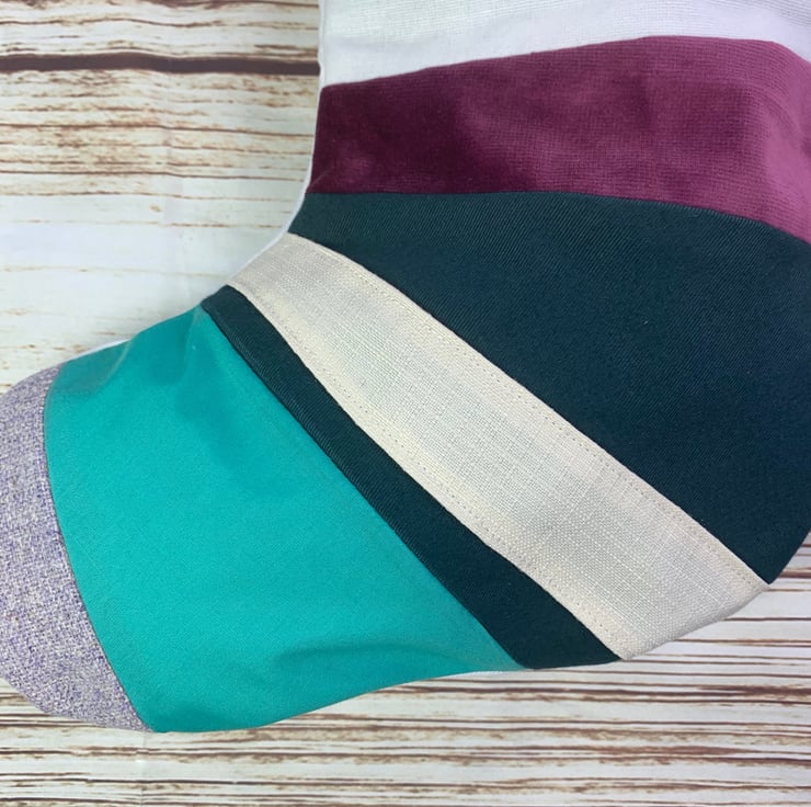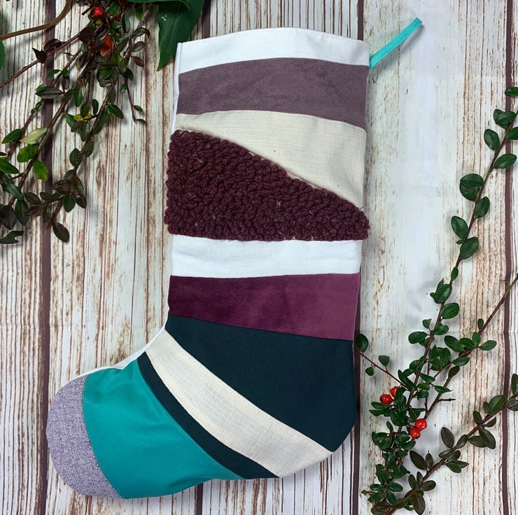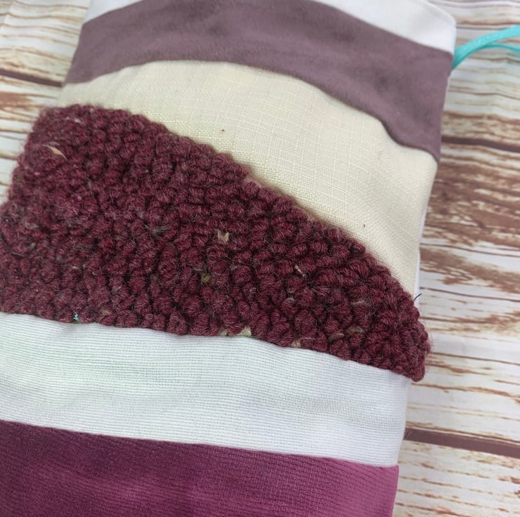 This is my patchwork luxury stocking, it's made up of different sections of fabrics and textures. One of the sections is punch hooked with a chunky aubergine wool to give a lovely soft textured area, other sections are built up with more fabric. I've used suede, velvety fabric and cottons and the hook is aqua cotton to coordinate. It's backed with a sturdy white twill too.