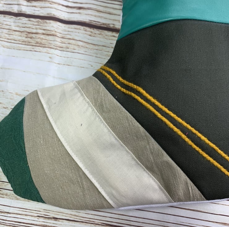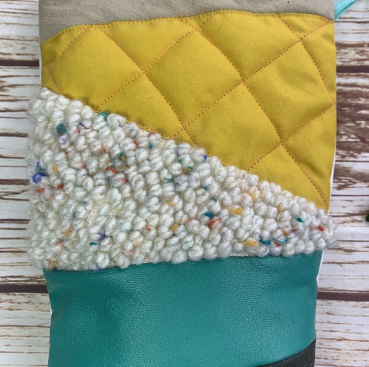 Anyway it's made up of different sections of fabrics and textures. One of the sections is punch hooked with a chunky cream flexed wool to give a lovely soft textured area other sections are built up with more fabric or pops of wool. I've used fake leather and real cottons, and the hook is a teal cotton to coordinate. It's backed with a sturdy white twill too.
