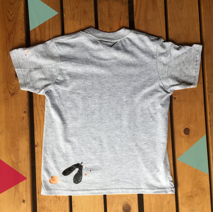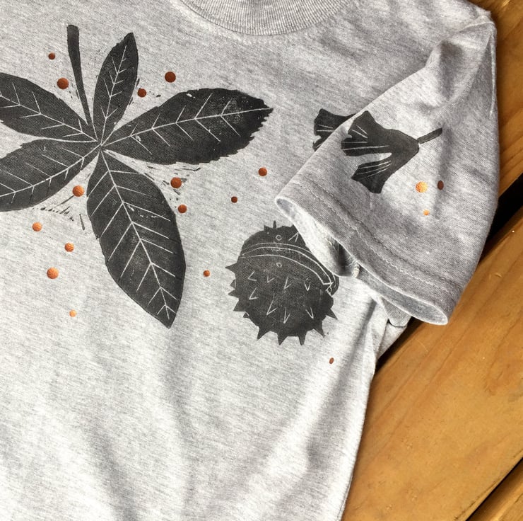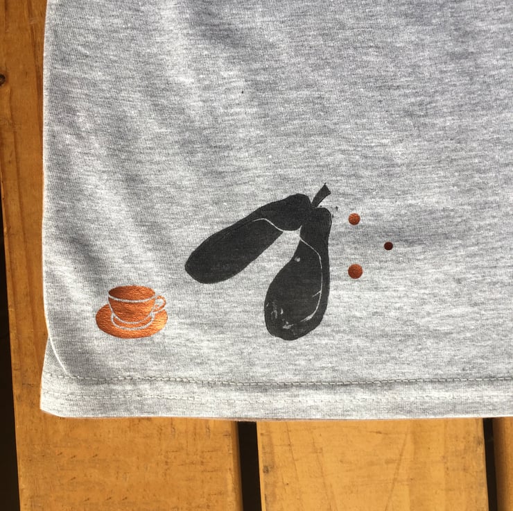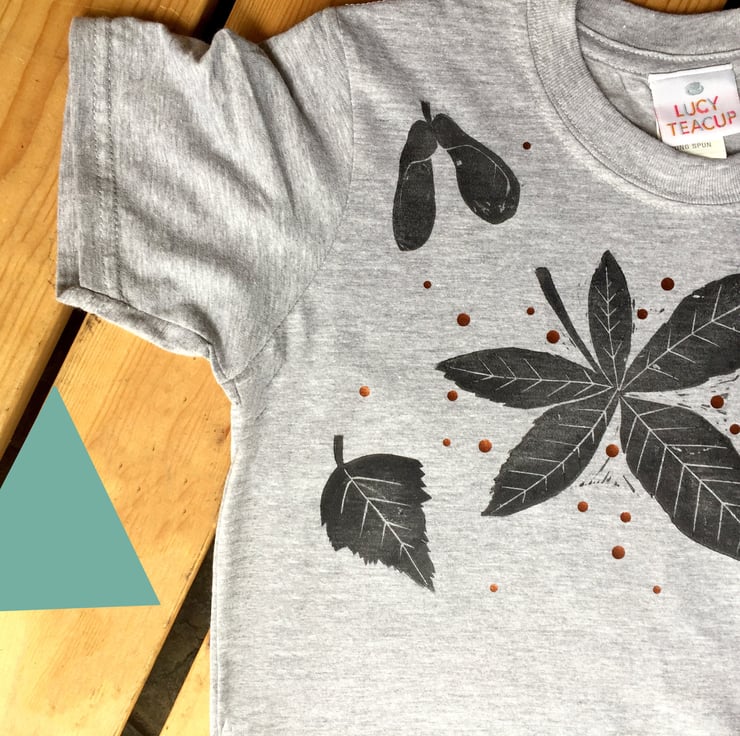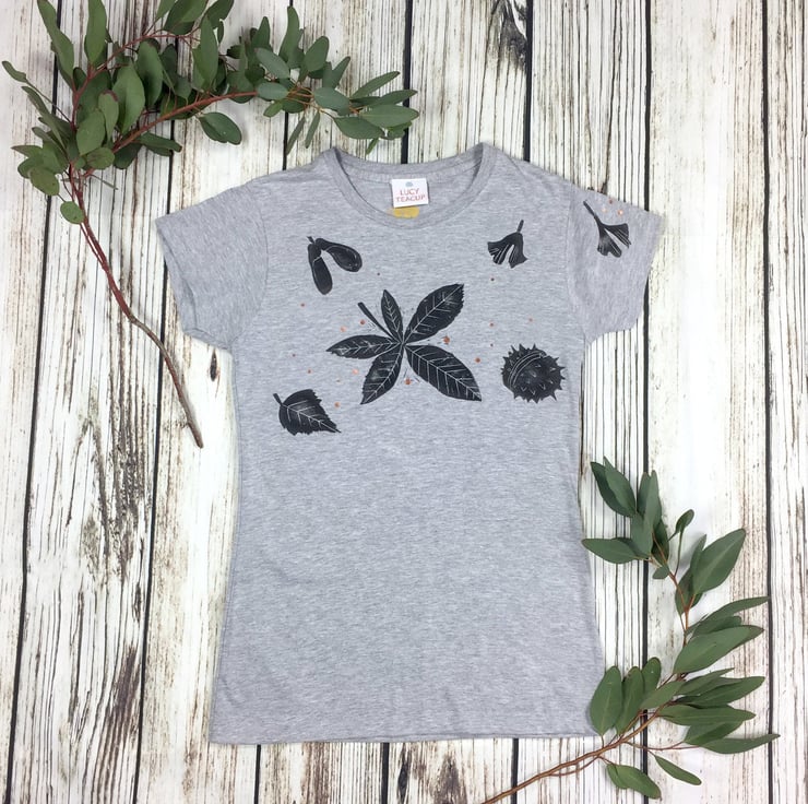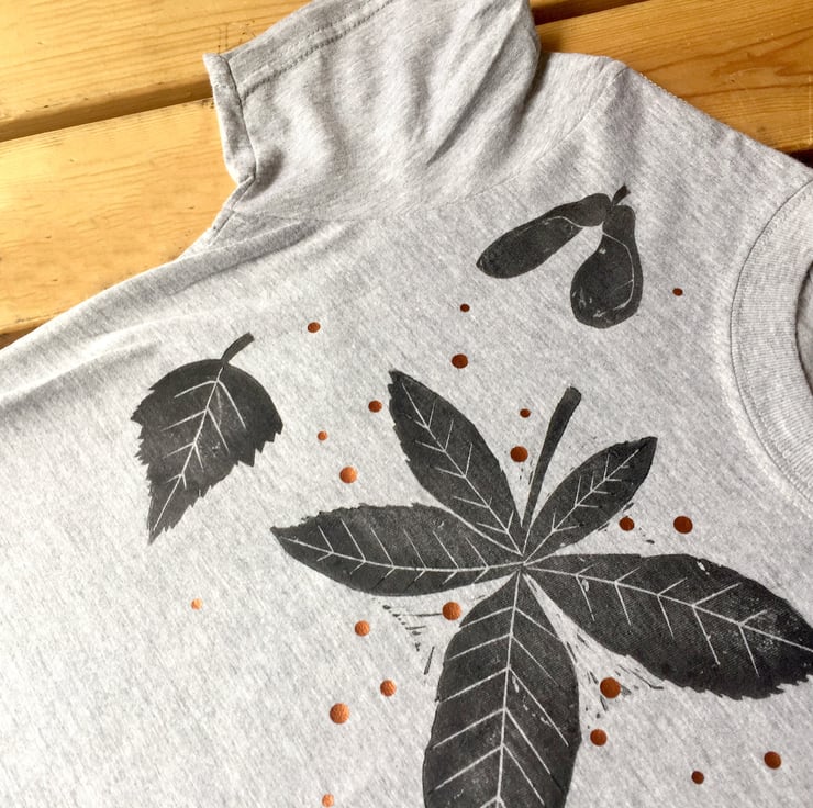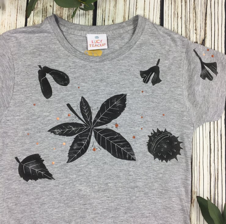 Each leaf is then handprinted so designs will vary slightly. I've added dots of copper foil onto heather grey t-shirts. The print also continues onto the sleeve and at the back lower left- with the Lucy Teacup cup logo!