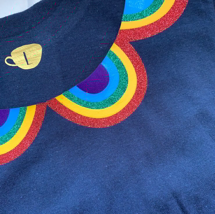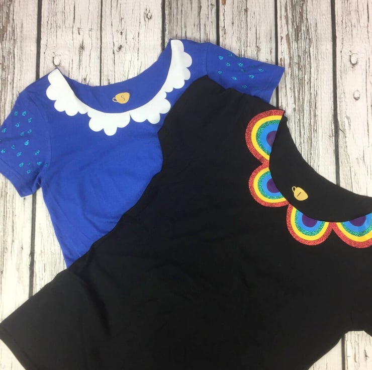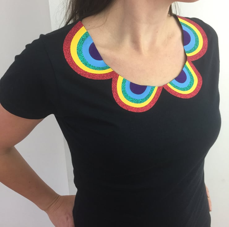 Rainbow Peter Pan Collar Woman's Black top with glitzy detail. Ladies T-Shirt