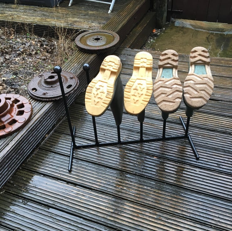 WROUGHT IRON WELDED 3 PAIR WELLINGTON BOOT RACK Handmade rack comes in a traditional wrought iron black painted finish. Stoutly made welded together as one piece from 12mm solid iron bar topped with a 30mm solid iron ball, standing 47cm 18 12" high 57cmwide and 28cm 11" deep. It is designed for 3pairs please ask for price if require made to hold more or less pairs 23456 as can be made to any size needed.
