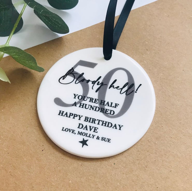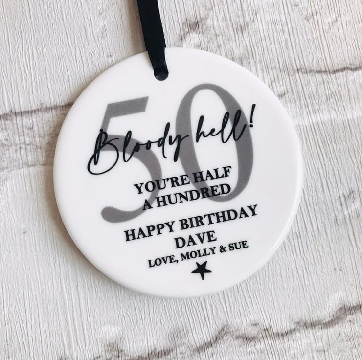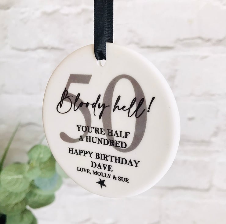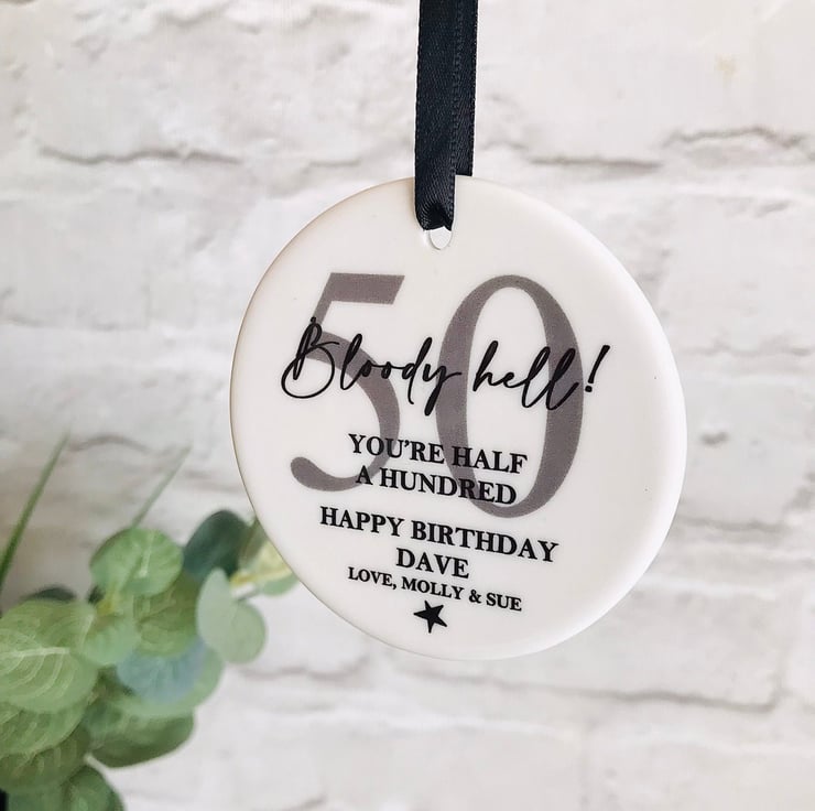 Personalised Bloody Hell you're half a hundred ceramic hanging ornament