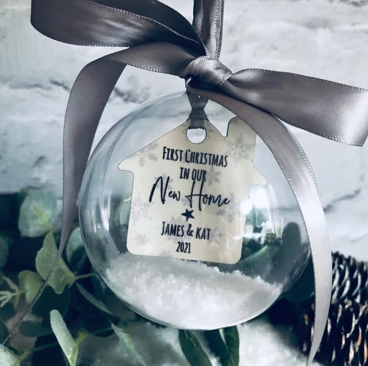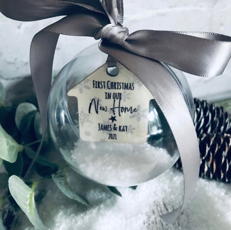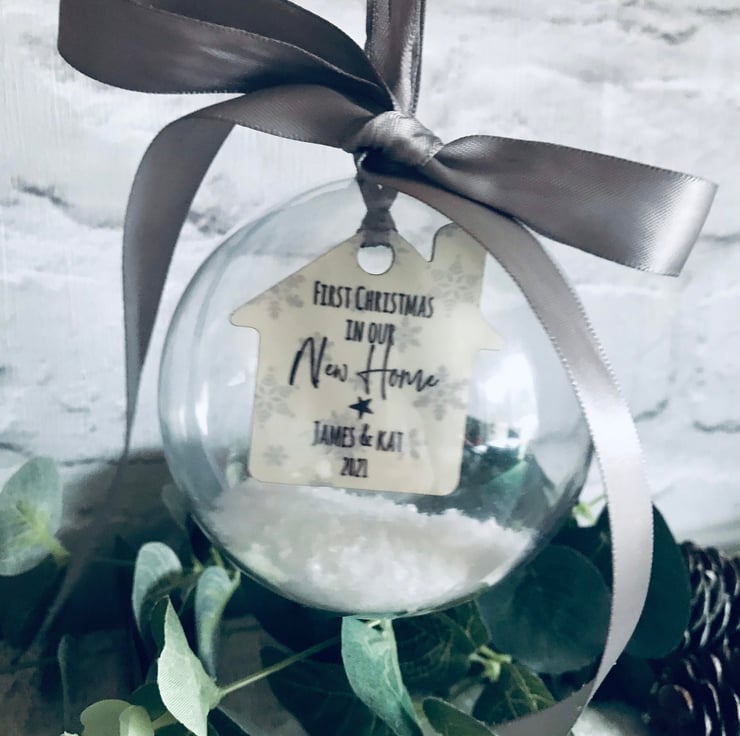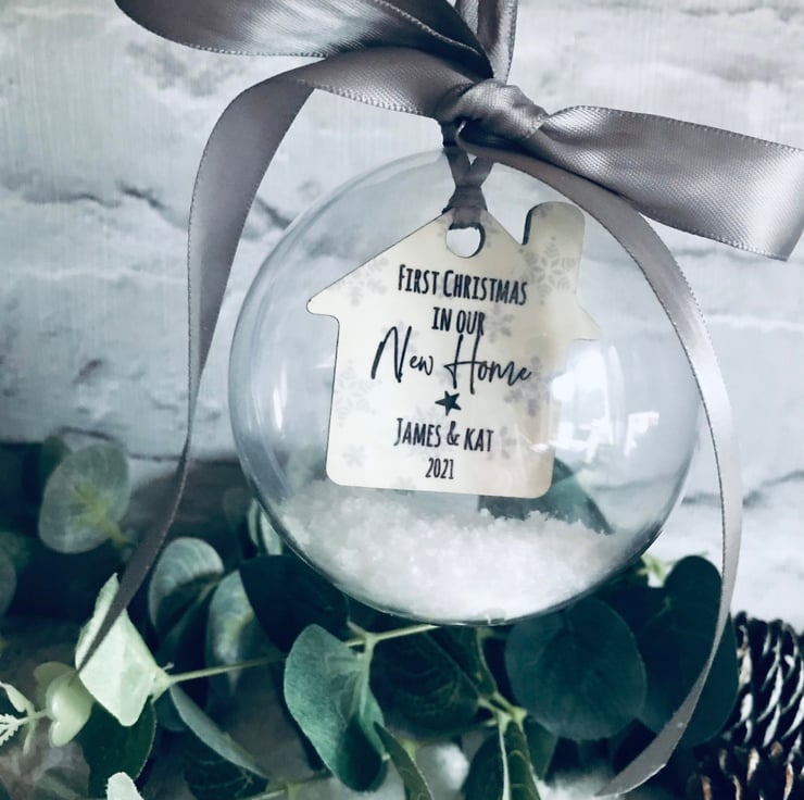 Personalised hanging clear bauble with personalised little house.