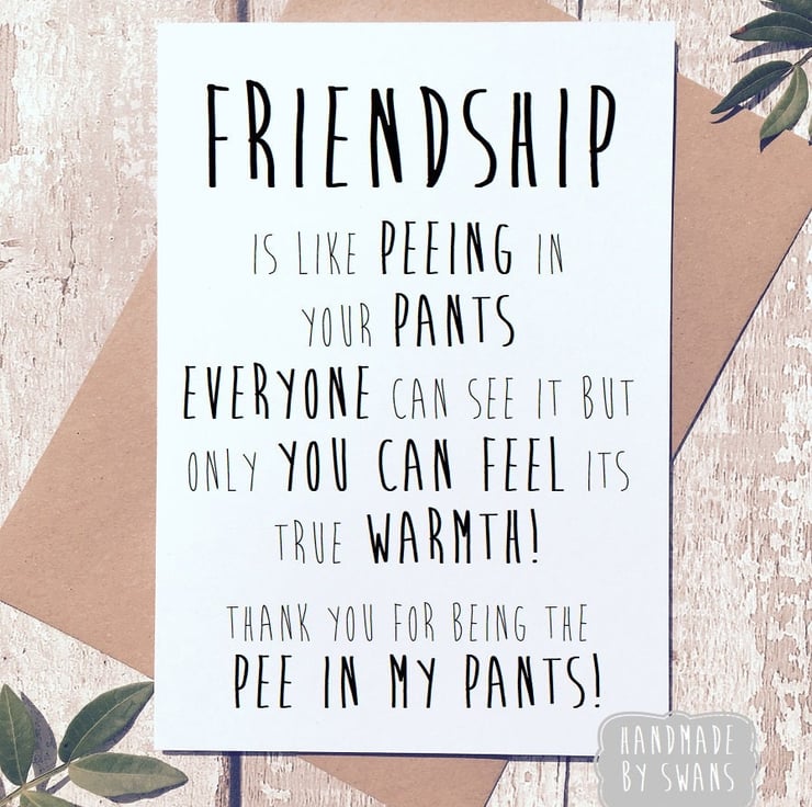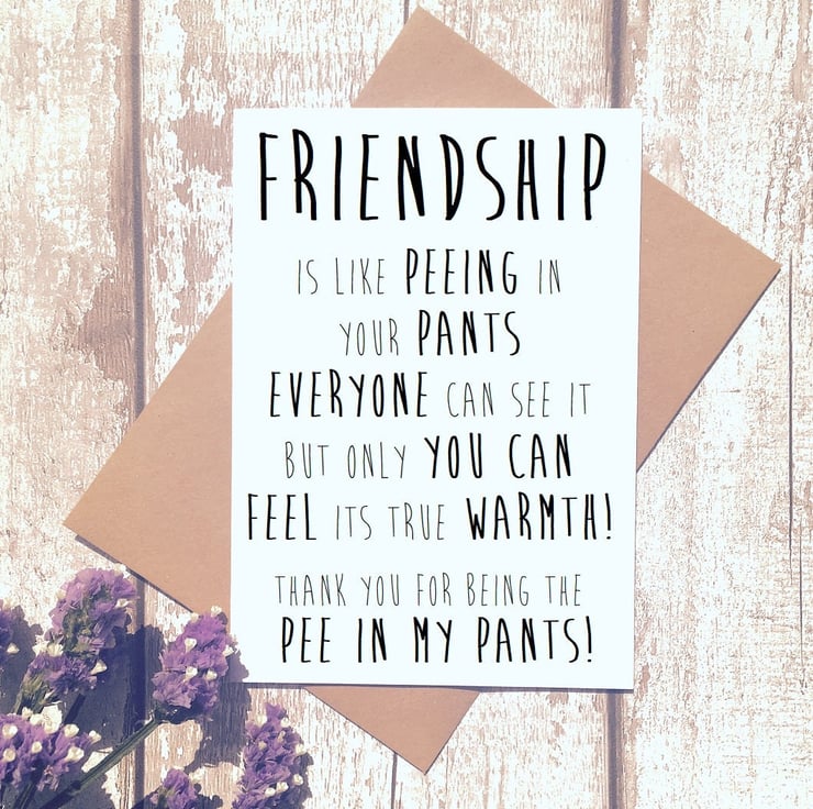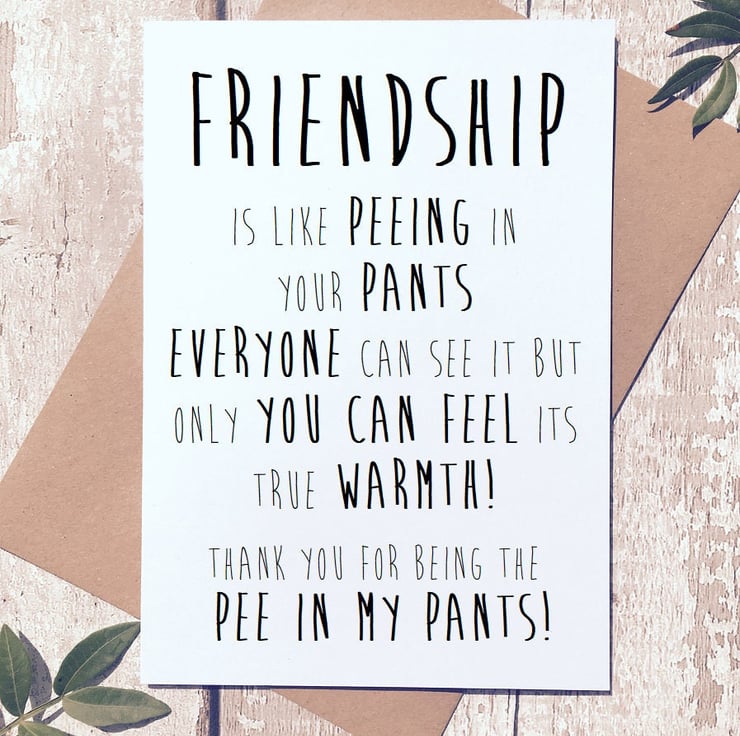 This card reads: friendship is like peeing your pants. Everyone can see it but only you can feel its true warmth. Thank you for being the pee in my pants