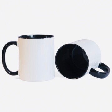 You are looking at a White porcelain mug, black handle and inner with a design to the front.