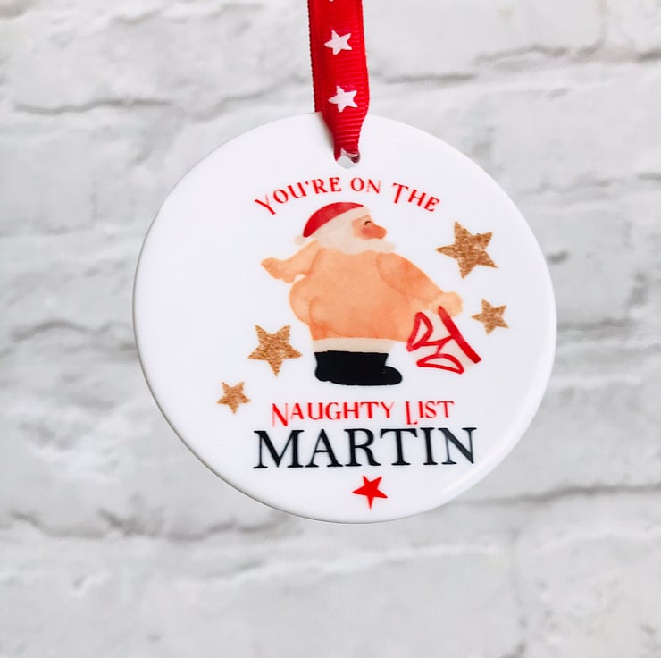 Funny Personalised naked Santa naughty list christmas Ceramic bauble hung with red and white star ribbon