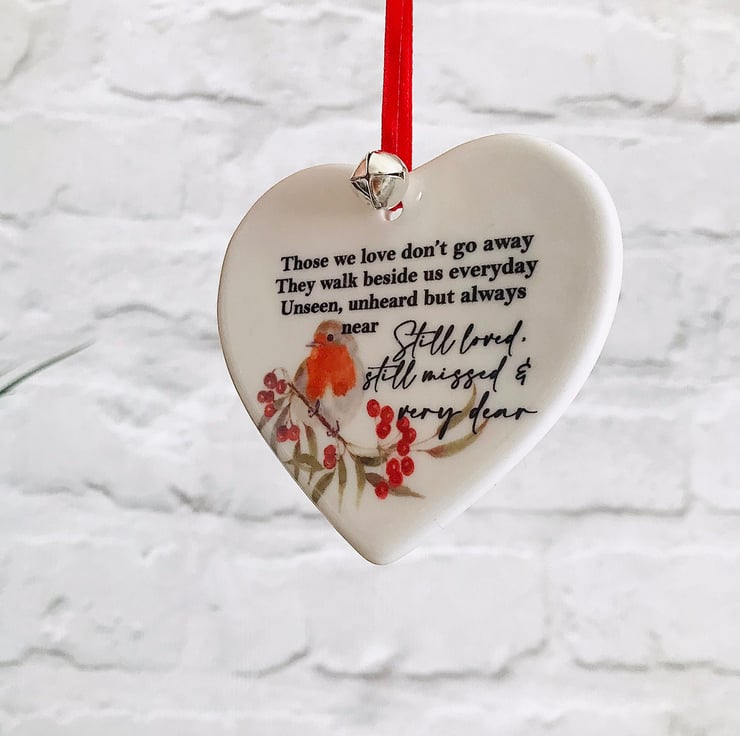 Hanging ceramic heart bauble with red satin ribbon and little bell.