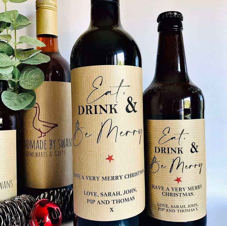 Personalised "Eat drink and be merry"replacement winebeer bottle label