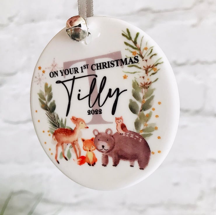 Personalised Childs first christmas Ceramic bauble hung with grey satin ribbon and a little jingly bell