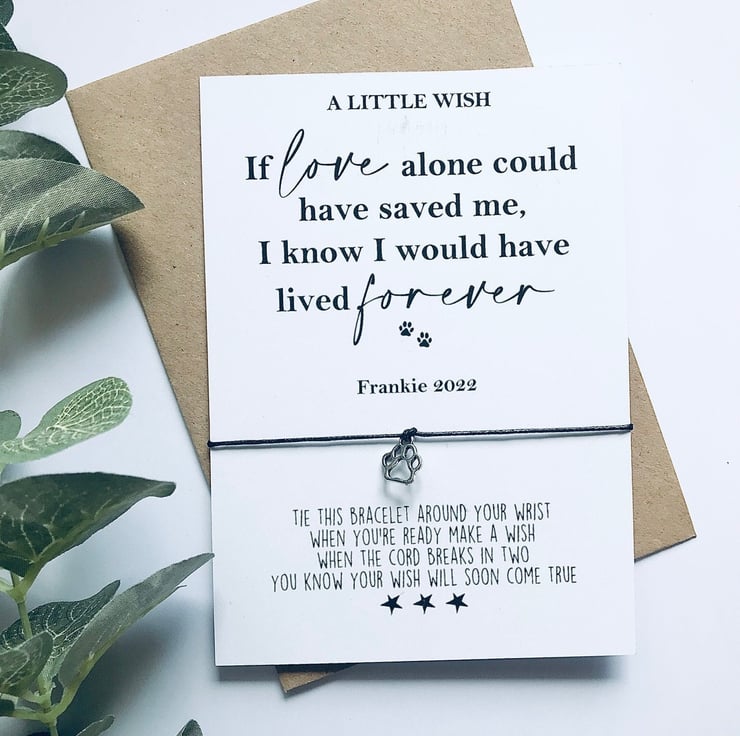 This cute little paw print wish bracelet comes on a 1mm blackwax cord which is attached to a printed A6 size piece of card