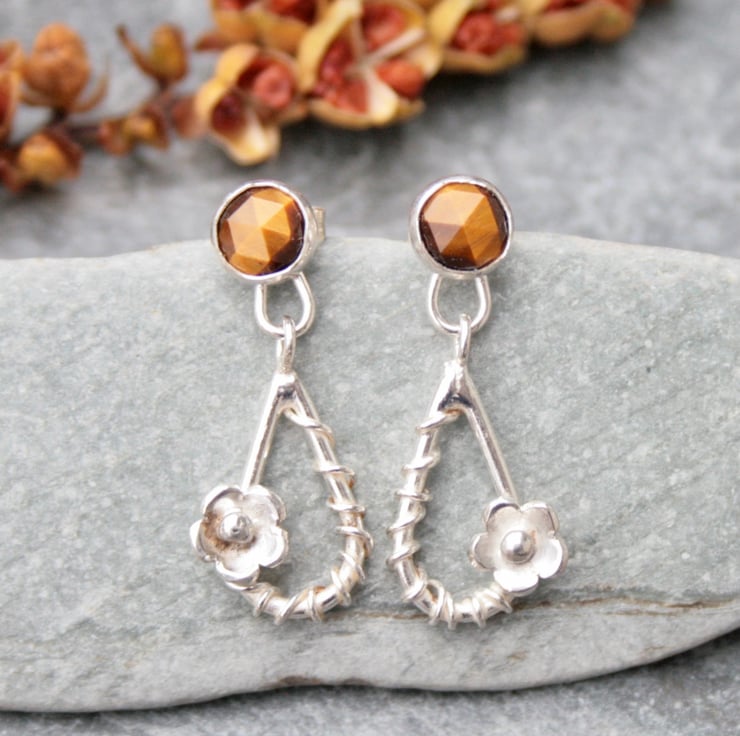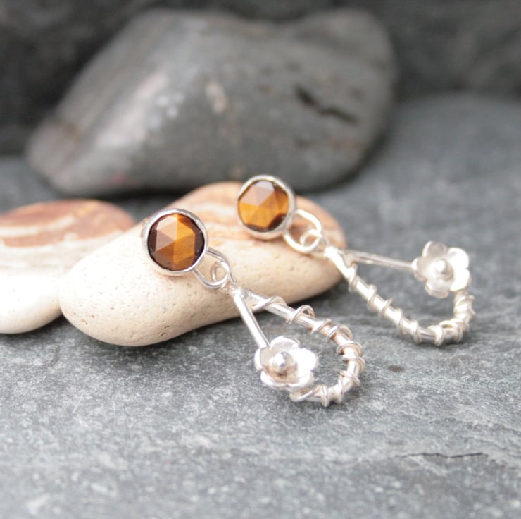 These handmade earrings have been created using gorgeous tiger's eye gemstones and sterling silver. The gemstones are set in sterling silver with silver teardrop shapes with little hand cut silver flowers hanging from them.