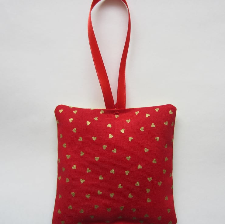 It is filled with Suffolk lavender hand picked and prepared by me and hangs with a red ribbon loop.