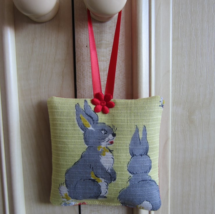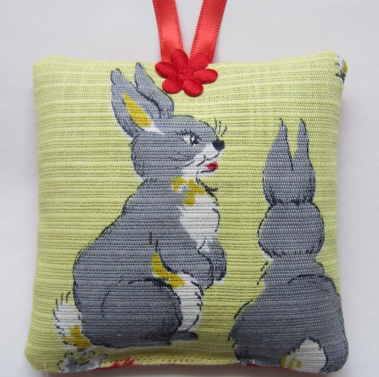 Hanging lavender sachet made from an unused vintage 1950s fabric featuring 2 bunny rabbits and backed with a red and gold hearts fabric