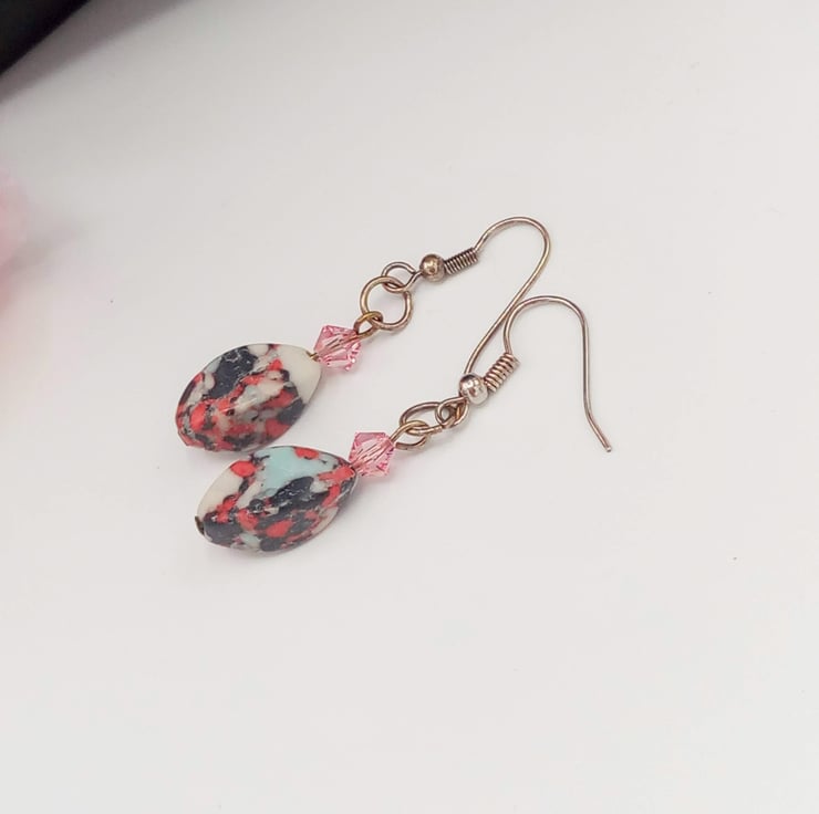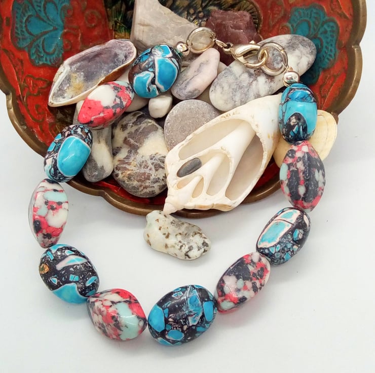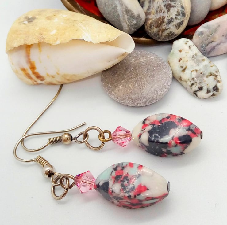 This jewellery set is made using round, oval and long tubular shaped mottled pink and blue beads with two pink bicone beads on the earrings. The necklace and bracelet have an antique silver plated lobster clasp and the earrings have antique silver plated wires.
