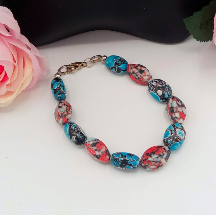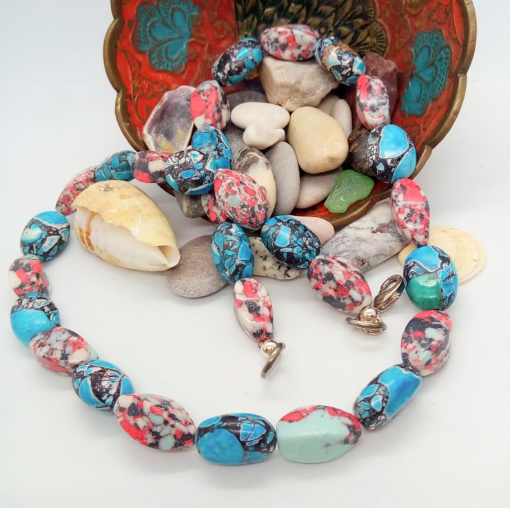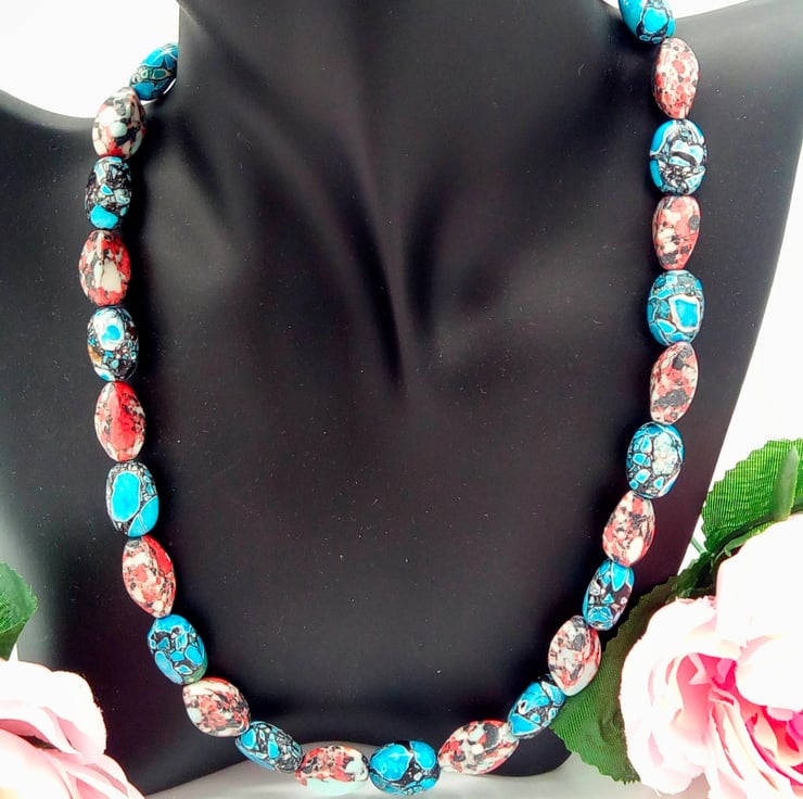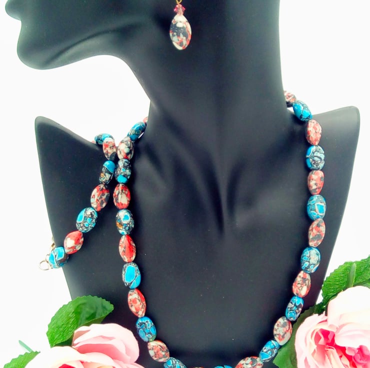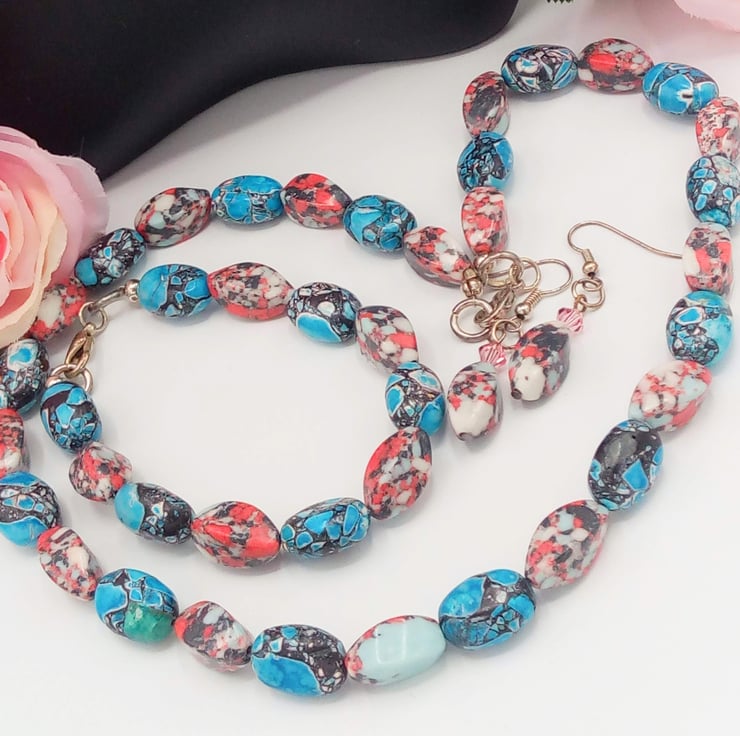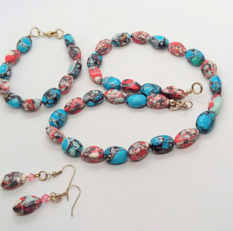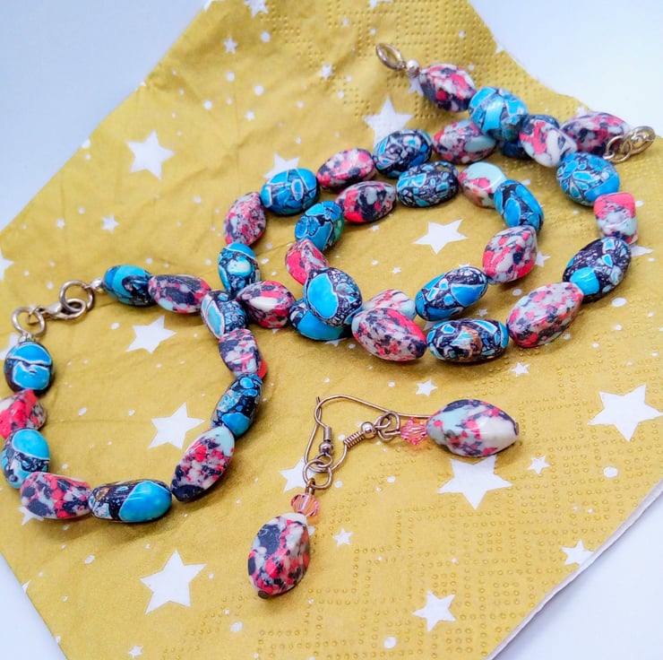 This lovely jewellery set comprises a necklace, earrings and bracelet in mottled pink and blue glass beads. It would perfectly complement any dress or outfit that you choose for any day out, daytime party or casual occasion. It would also make an ideal gift for a special lady, or a treat for yourself.