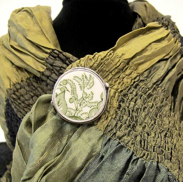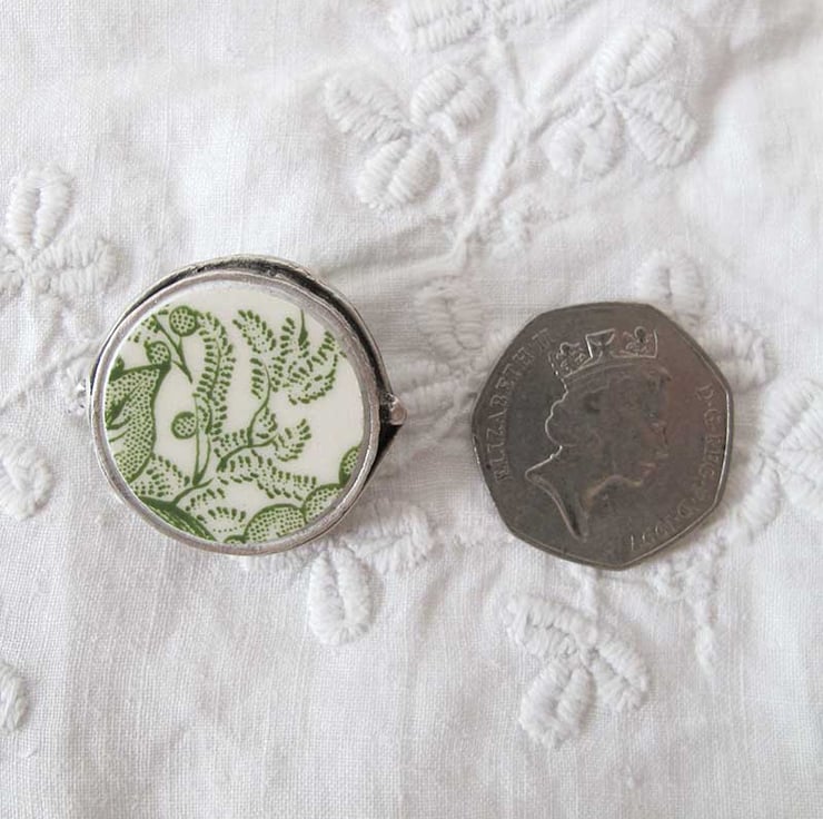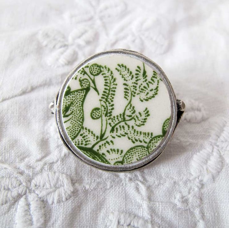 The brooch has been crafted from broken, chipped or crazed china that is no longer fit for purpose - no 'perfect' plates were harmed in the making of my jewellery! This piece is from a pretty green Mason's Ironstone plate. Each brooch is a unique statement piece and has it's own little characteristics from the vintage china it's been taken from. It makes a very unusual and stylish gift.