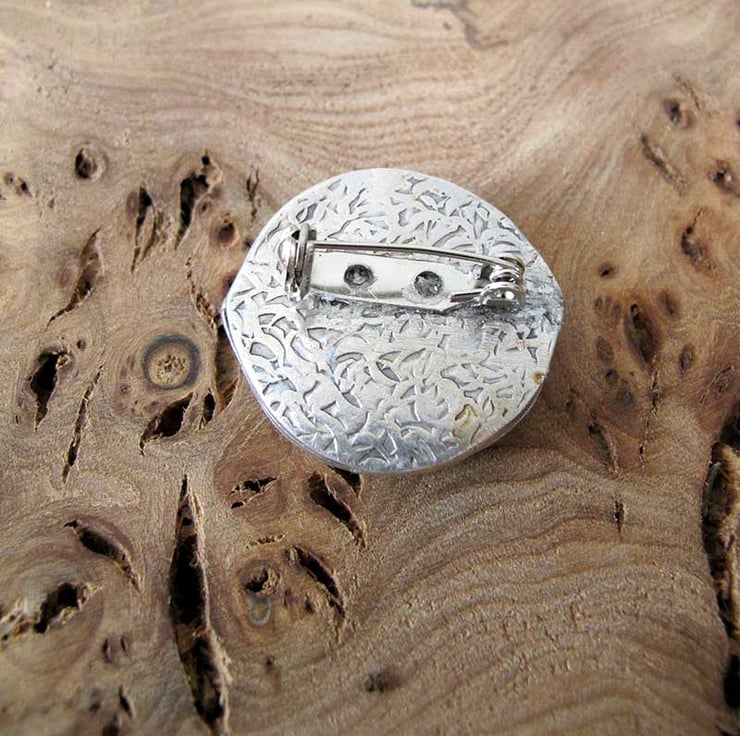 A beautiful hand crafted brooch made from a vintage china plate, in an antiqued silver metal mount. The brooch measures 3cm diameter and 0.7cm deep, not including pin.
