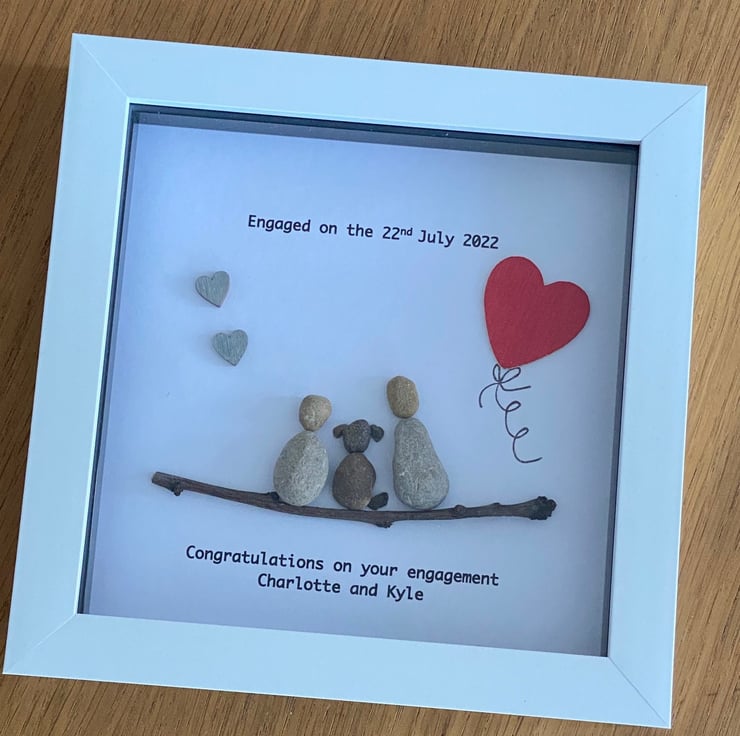 Engagement Pebble Frame, Personalised Engagement Gift, Engaged Couple with Dog F
