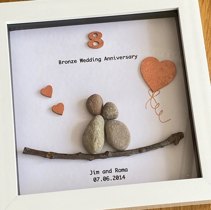 Frame Measures 15cm x 15cm and is decorated with wooden twigs and hearts, pebbles, wooden numbers and bronze effect heart