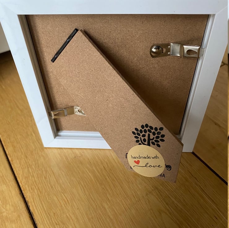 Frame measures approx 15cm x 15xm, comes with glass cover and can either be hanged or free standing.