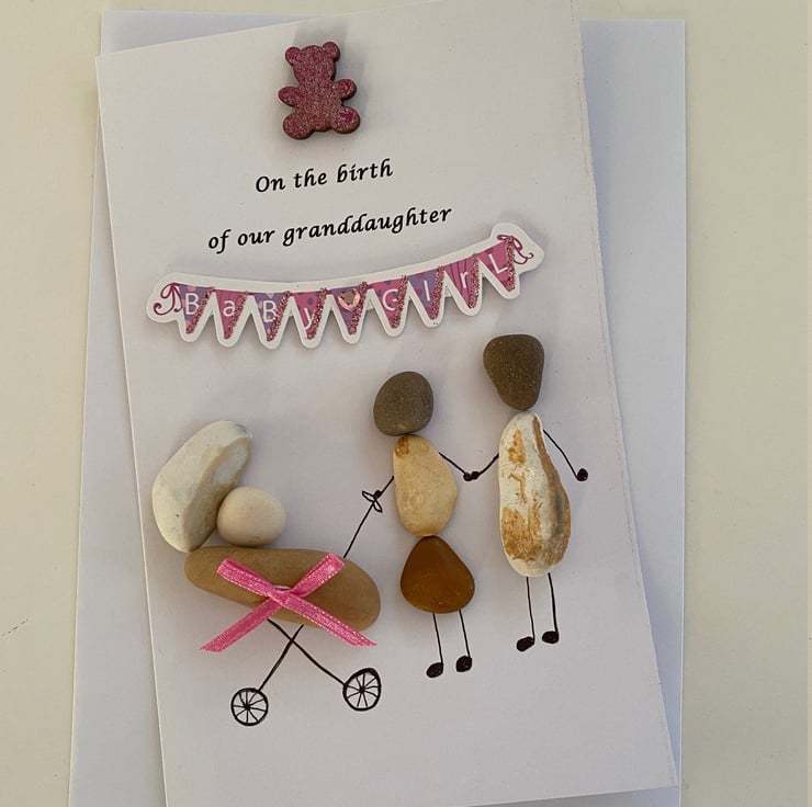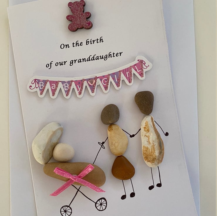 Baby Girl Birthday Card, Personalised Baby Gift, Pebble Artwork Baby Shower Gift