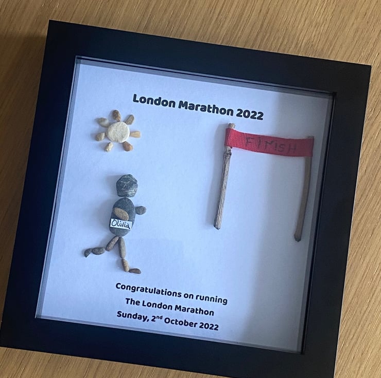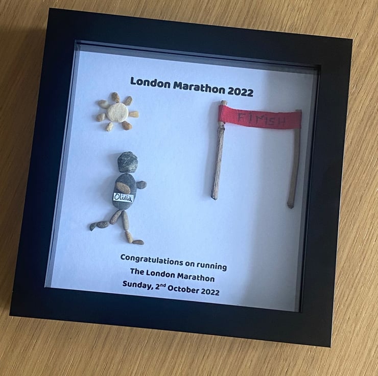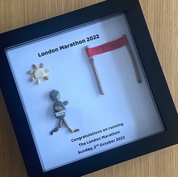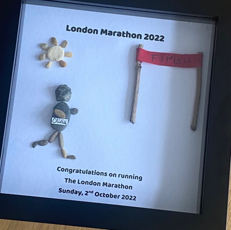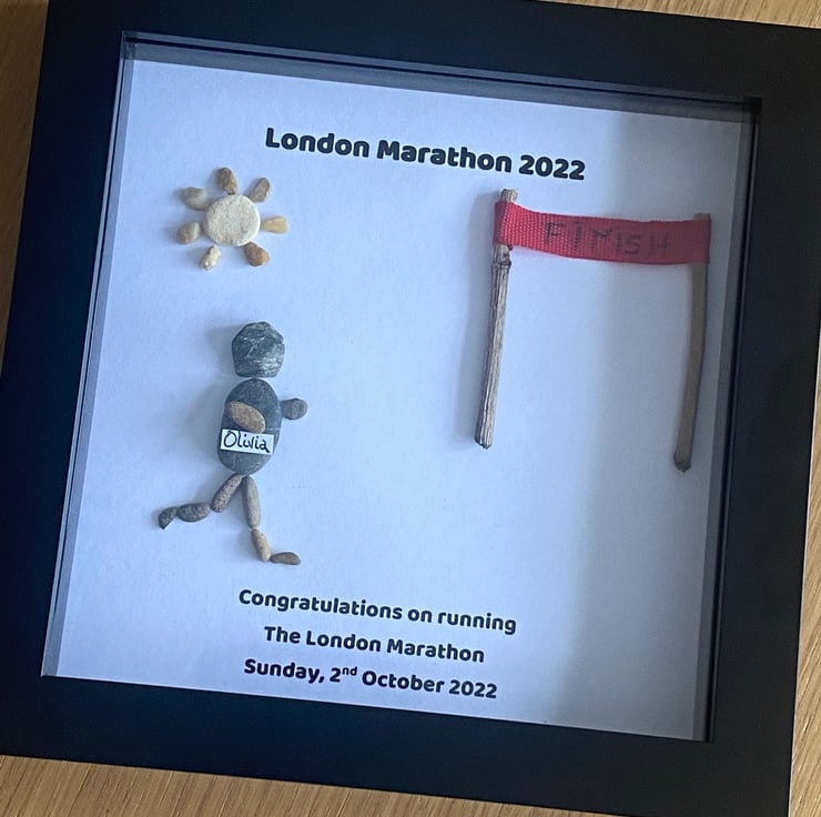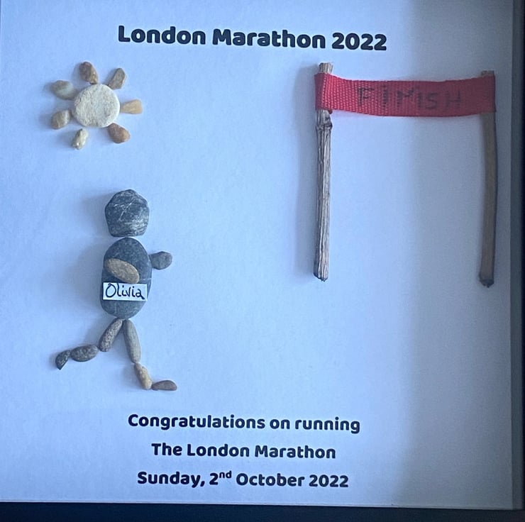 Decorated with pebbles to represent a person running and also the sun, wooden sticks and ribbon to represent the finishing line
