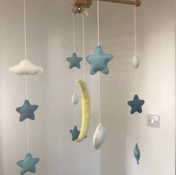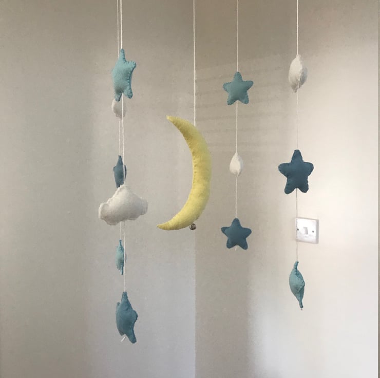 Made with Wool Felt and Natural Wood. Contains clouds, stars and a moon