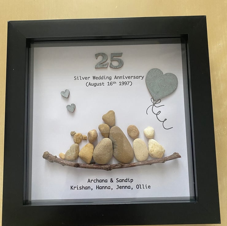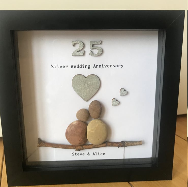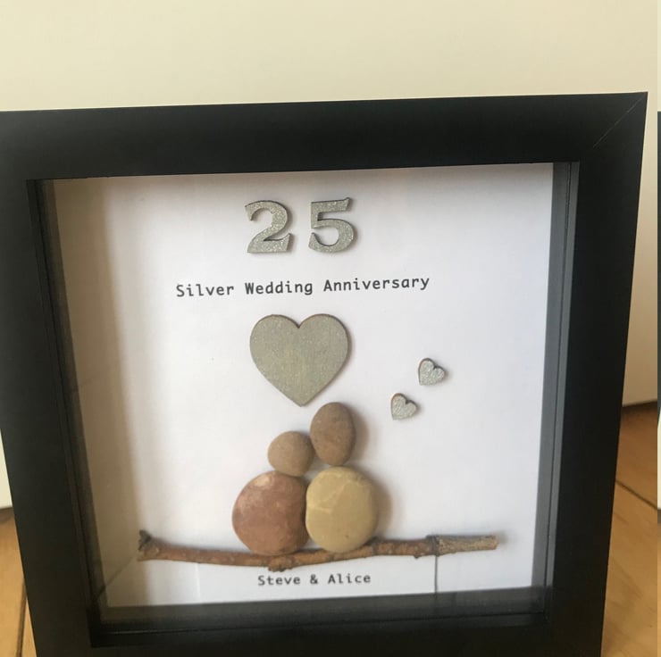 Made to order picture, 15x15 cm frame size, Silver anniversary gift, 25th anniversary picture, Silver wedding anniversary, Pebble art picture, Couple gift with silver heart, 25th anniversary present, Family 25th anniversary gift with silver heart, Pebble art couple, Personalised gift, Unique gift, Family gift, Happy 25th anniversary, 25 years together, Silver anniversary